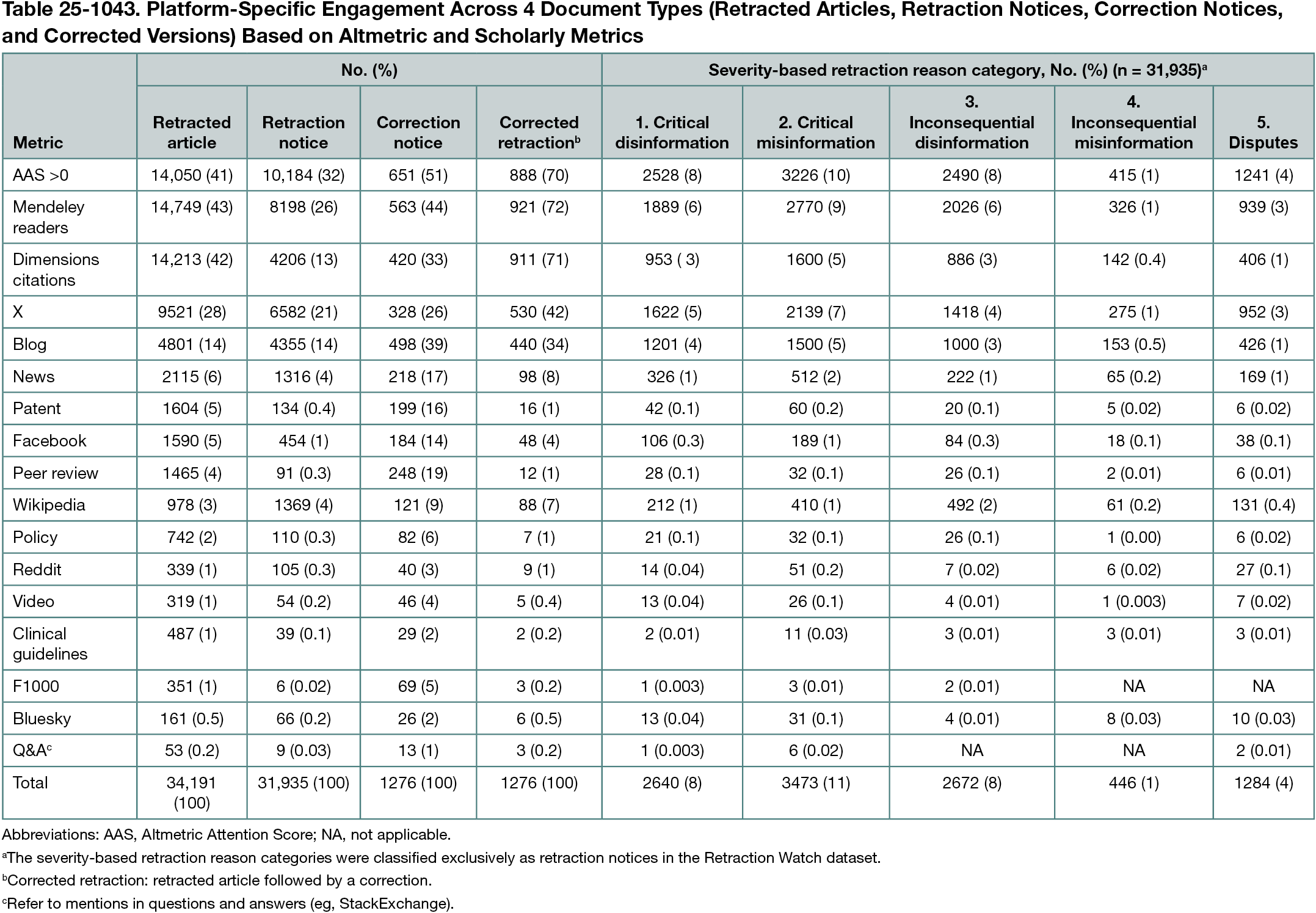 This cross-sectional study analyzes altmetric data of retracted and corrected publications from multiple sources. Data were extracted in November and December 2024 from Retraction Watch, Scopus, and Altmetric.com (and updated in June 2025). The dataset comprised (1) 34,191 DOIs of original articles (later retracted), (2) 31,935 DOIs of retraction notices, (3) 1276 DOIs of correction notices, and (4) corrected versions (ie, retracted articles followed by a correction). To ensure clarity in altmetric attribution, we excluded records in which a single DOI was assigned to both the original article and its corresponding retraction or correction notice. Retraction reasons were coded using a 6-zone classification framework (based on Sormanen et al2) that distinguishes both intent and (nonscholarly) consequence: critical disinformation (eg, data falsification or fabrication), critical misinformation (eg, unreliable analyses or results), inconsequential disinformation (eg, duplication or plagiarism), and inconsequential misinformation (eg, miscommunication or lack of approvals), along with disputed (eg, expressions of concern) and ambiguous cases. Each publication was counted using a severity-exclusive method: when multiple reasons were present, the record was assigned to the most severe applicable category (Table 25-1043). Platform-specific mention counts were analyzed across 16 altmetric platforms, including news media, blogs, X/Twitter, Mendeley, Dimensions, and policy documents. Engagement levels were compared across document types, and how these varied by reason category were examined.