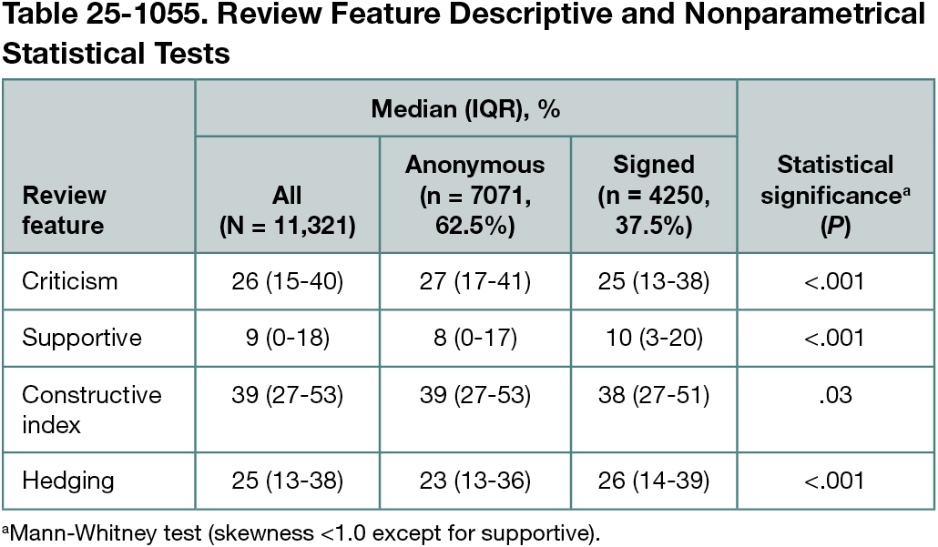 Of the 11,321 peer review reports, 7071 (62.5%) were anonymous and 4250 (37.5%) were signed (Table 25-1055). Few reports were supportive (overall median of 9%). Higher levels (27% of anonymous reviews and 25% of signed reviews) contained criticisms of the research. A similar level of hedging was observed. Significant differences were observed between the 2 groups; signed reviews showed significantly fewer criticisms and higher levels of hedging.