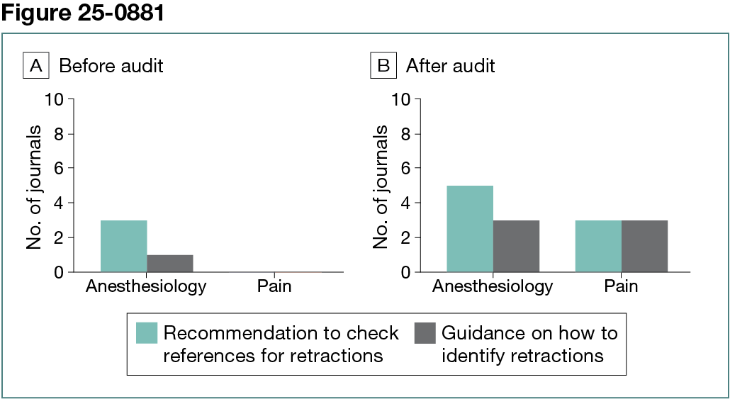 The baseline audit was performed in April 2024. The mean (SD) impact factor was 3.6 (1.5) for pain journals and 4.6 (2.6) for anesthesiology journals. Twelve of 20 pain journals and 9 of 20 anesthesiology journals were ICMJE signatories. At baseline, 0 of 20 pain journals and 3 of 20 anesthesiology journals included recommendations to check references for retractions and 0 of 20 pain journals and 1 of 20 anesthesiology journals provided guidance on how to identify retractions. At 6-month follow-up in October 2024, 3 of 20 pain journals and 5 of 20 anesthesiology journals included recommendations to check references for retractions and 3 of 20 pain journals and 3 of 20 anesthesiology journals provided guidance on how to identify retractions (Figure 25-0881). Overall, this represented an absolute score change of 25%. Correspondence with editors of 2 pain journals and incorporation of the guidance template in 1 pain journal confirmed that these changes resulted from the feedback intervention.