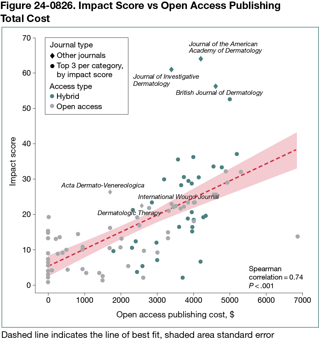 Median OA publishing costs were significantly higher for hybrid journals than full OA journals ($3675 vs $350, respectively; P < .05). Hybrid journals also showed significantly higher median impact scores than full OA journals (23.95 vs 9.23; P < .05) (Figure 24-0826). A moderate positive correlation (R = 0.66) was observed between OA publishing costs and impact scores. The Journal of Drugs in Dermatology, Indian Journal of Dermatology, and Dermatology Online Journal were the top 3 cost-effective paid OA options. The Journal of Clinical and Aesthetic Dermatology and the Indian Journal of Dermatology, Venereology, and Leprology were identified as top free OA journals.