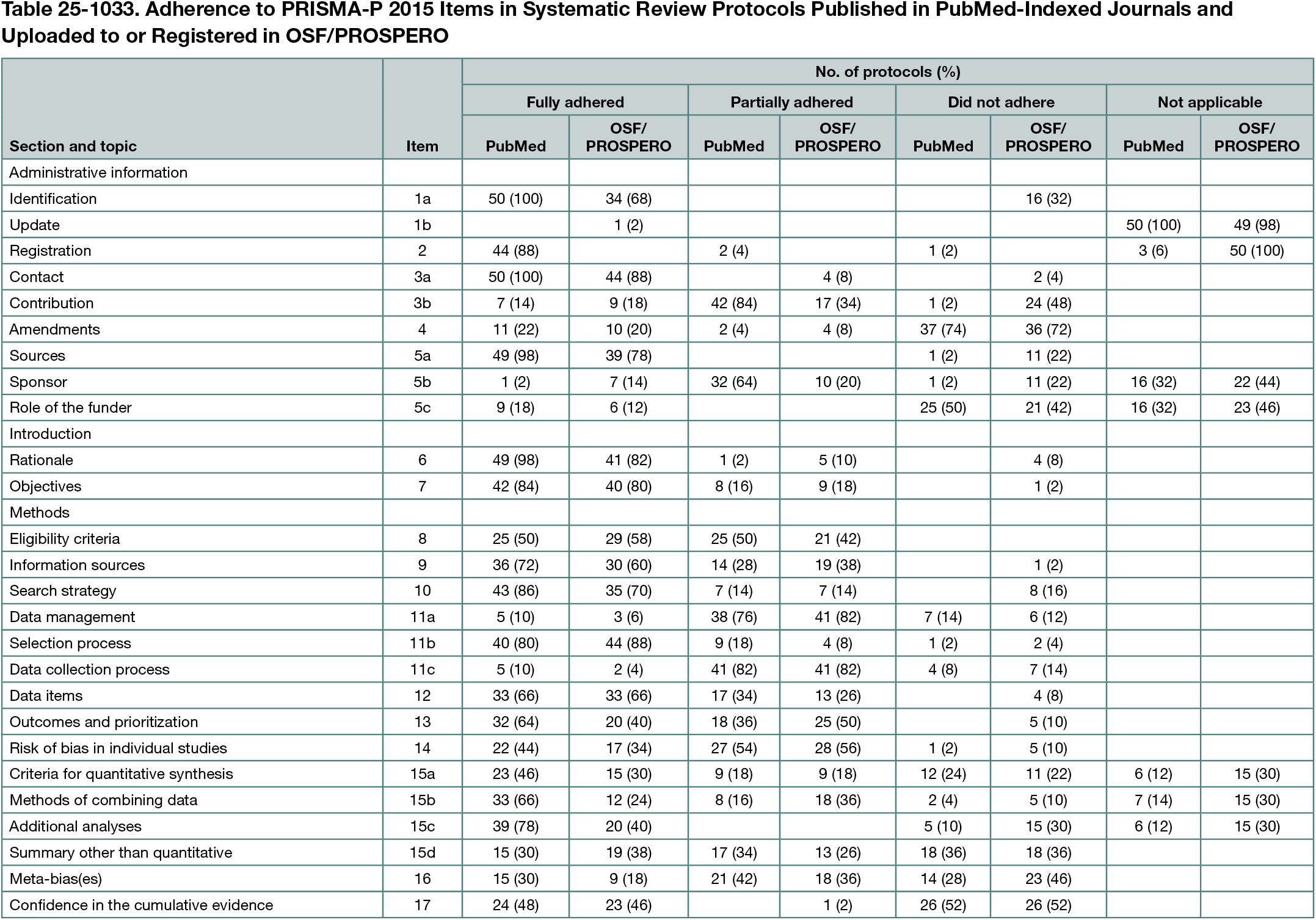 The PubMed-indexed protocols fully adhered to a median of 60% (range, 36%-80%) of PRISMA-P 2015 items. The equivalent median for OSF/PROSPERO protocols was 45% (range, 25%-88%). In both types of protocols, items not adhered to in more than 25% of the protocols were related to protocol amendments (item 4), role of the funder (item 5c), methods for planned summary other than quantitative (item 15d), meta-bias(es) (item 16), and confidence in the cumulative evidence (item 17) (Table 25-1033). In both types of protocols, 11 items partially adhered to in more than 25% of the protocols were lacking, eg, descriptions of procedures for data selection from multiple reports of the same study (item 11c). Of the 43 invited authors, 15 (9 men, 6 women) participated in the interviews. From the predefined themes, several suggestions for the PRISMA-P 2015 update emerged. Some suggestions regarded adding or modifying existing content, eg, to report conflicts of interest or how to report data synthesis when no meta-analysis was planned; other suggestions were more generic, eg, to add links to the Elaboration & Explanation paper.
