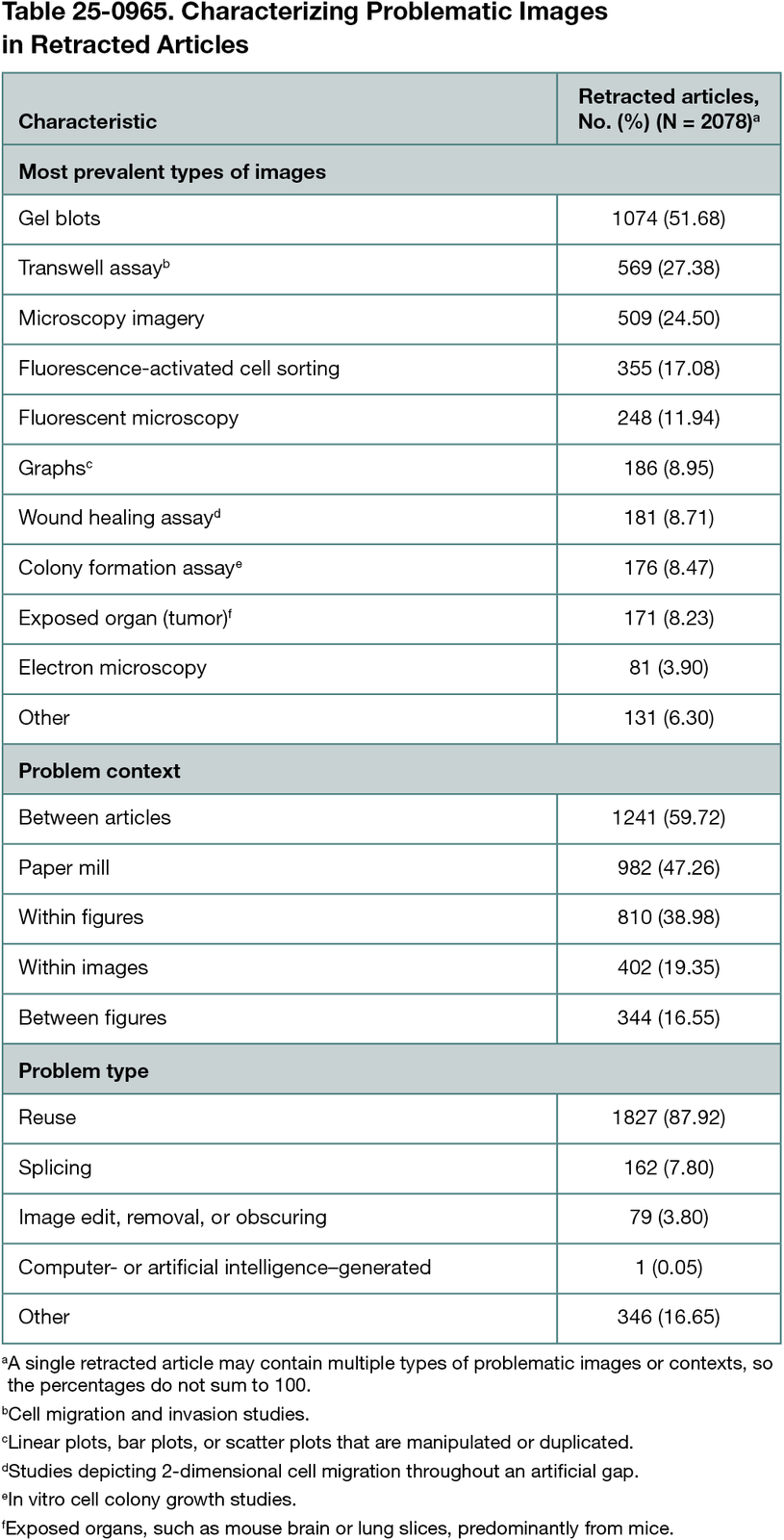 The Table presents our results (Table 25-0965). Gel blots (eg, Western blots) were the most frequently cited image type in problematic retractions, appearing in 1074 articles (51.68%). Between-article image reuse, where an image and its associated data are duplicated across different publications, was the most common context of misuse, identified in 1241 cases (59.72%). Notably, 982 retractions (47.28%) were attributed to paper mills. Image duplication was the predominant cause of retraction, accounting for 1827 cases (87.92%). Only 1 retraction was attributed to computer- or artificial intelligence–generated manipulation. While our analysis did not filter by the biomedical area, most problematic images originated from the biomedical domain.