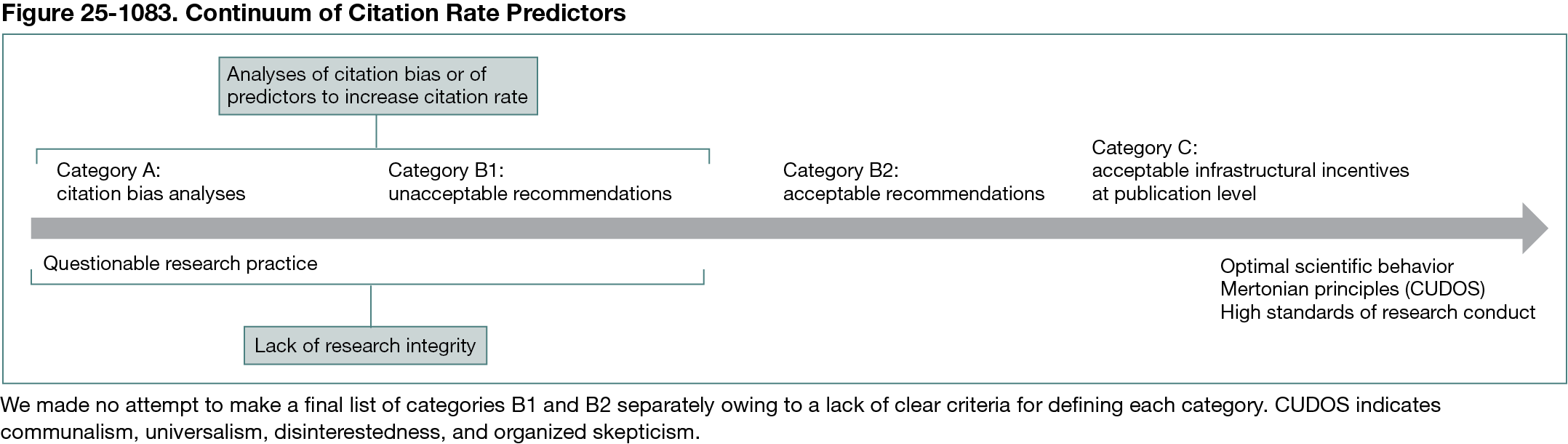 A total of 165 studies published between 1982 and 2023 were included. Fifty-four distinct factors were identified, encompassing 4,471,352 original studies, and were grouped into 4 categories: author-related (n = 17), study-related (n = 19), reporting-related (n = 10), and journal-related (n = 8). Among the 786 analyses evaluating these factors, 429 (54.6%) identified a significant increase in citation rates, 49 (6.2%) found a decrease, and 251 (31.9%) reported no effect. Most factors associated with increased citation rates were unrelated to the scientific content of the studies and instead reflected extrinsic characteristics. As the intention, interpretation of results, and conclusions varied considerably across the included studies, we categorized them based on how they analyzed factors associated with citation rates (Figure 25-1083). Of the 165 studies, 77 (46.7%) were classified under category A, which examined citation bias. In contrast, 81 studies (49.1%) (categories B1 and B2) recommended leveraging specific characteristics to enhance authors’ own citation rates. Category B was further subdivided due to ambiguity in distinguishing ethically acceptable recommendations from potentially conflicting (ie, unacceptable) ones. Seven studies (4.2%) examined factors that could improve the accessibility of published studies. Figure 25-1083 presents these categories along a continuum ranging from questionable research practices to optimal scientific behavior.