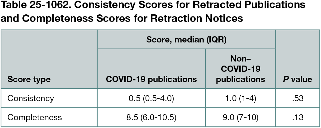Of 441 publications, 47 were about COVID-19 and 394 were not. COVID-19 publications were published between 2019 and 2022, while non-COVID 19 publications were published between 1978 and 2022. COVID-19 publications were most frequently retracted due to concerns about reliability of data or results (15 [31.9%]) compared with plagiarism (82 [20.8%]) for non–COVID-19 publications. The median time between publication and retraction was 120 (IQR, 15-196) days for COVID-19 publications and 326 (IQR, 124-789) days for non–COVID-19 publications (P < .001). Across 11 databases, 41.2% (110 of 267) of records retrieved for retracted COVID-19 publications were marked as retracted compared with 47.6% (1225 of 2574) for non–COVID-19 publications. There was no statistically significant difference between consistency or completeness scores for COVID-19 vs non–COVID-19 retracted publications (Table 25-1062). No publications met all criteria.