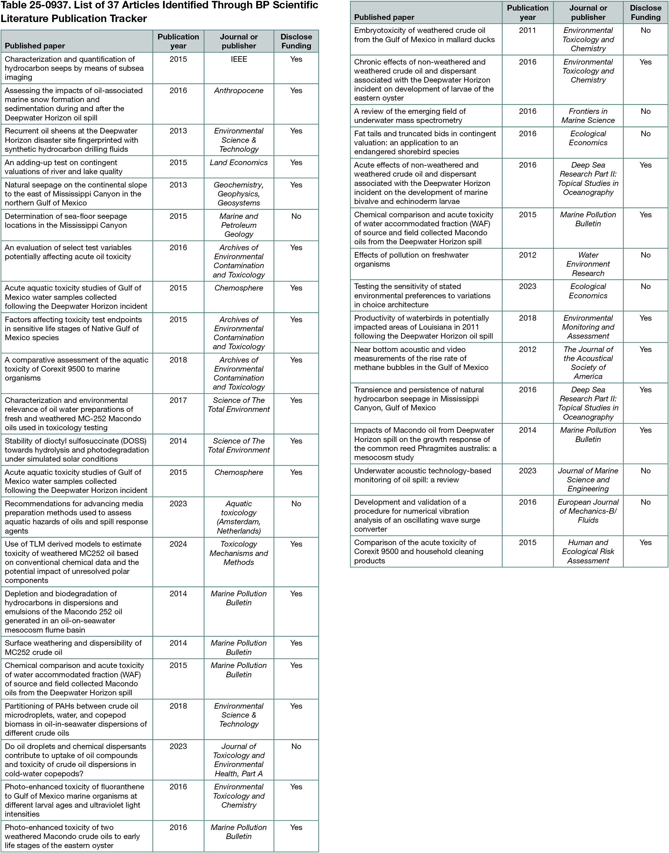The analysis highlights BP’s direct role in the production of 37 peer-reviewed articles, as identified in one of the 9 leaked internal documents, “Scientific Literature Publication Tracker.”1 The body of literature under review was published between 2011 and 2024. Collaborating with institutions such as Florida International University, Oregon State University, SINTEF research company, and Commonwealth Scientific and Industrial Research Organisation, BP shaped research agendas, defined testing protocols, and influenced interpretations of results. A large portion of the articles (33) focused on “seeps,” emphasizing natural seepage and exploration risks, while other themes included surf waters (18 articles), dispersants (12 articles), oil weathering (11 articles), and Corexit (6 articles). These studies often advanced conclusions that aligned with BP’s strategic interests, such as promoting the ecological and economic benefits of chemical dispersants. Notably, less frequent topics like phototoxicity (3 articles) or biological impacts received comparatively limited attention. BP’s editorial practices frequently framed findings within narrowly defined scopes to minimize ecological and legal accountability, steering the scientific narrative away from issues that could increase its liability. Among 37 articles, 17 did not disclose BP’s involvement in the writing process, while 21 articles explicitly acknowledged BP’s role. Although the 21 articles mentioned BP’s funding and their receipt of a portion of the $500 million allocated through the Gulf of Mexico Research Initiative, they did not disclose any editorial review conducted by BP (Table 25-0937).