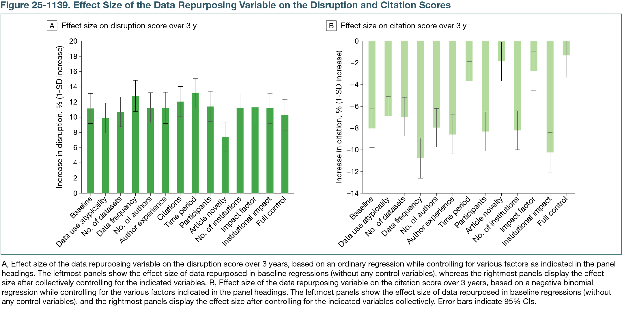 Greater data repurposing was significantly associated with higher disruption scores, corresponding to a 10.2%-SD increase (P < .001) (Figure 25-1139, A). However, articles with repurposed data were slightly negatively associated with citation counts compared with articles without repurposed data, corresponding to a 1.7%-SD decrease, but this was not statistically significant (P > .05) (Figure 25-1139, B). Articles with 1-SD higher repurpose adoption were modestly more disruptive (+2%; P < .001) and showed a stronger positive association with future citations (P < .001). This study is limited by reliance on the OpenAlex database, which may have incomplete metadata.