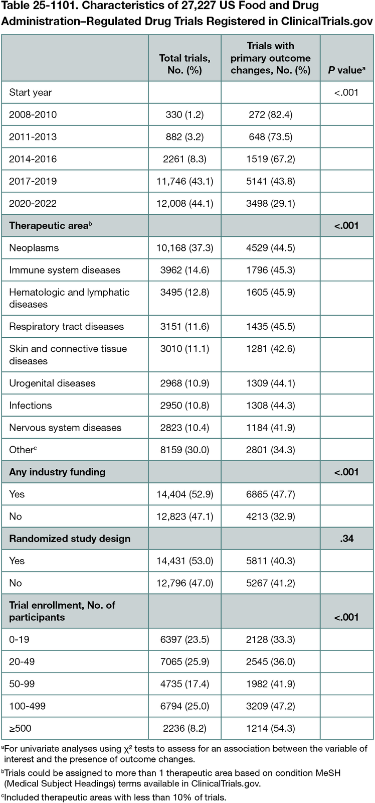 Among 27,227 trials studying FDA-regulated drugs, 11,078 (40.7%) had changes to primary outcomes after trial start. This included 3850 trials (14.1%) with addition of an outcome, 3123 (11.5%) with removal of an outcome, and 9105 (33.4%) with substantial outcome modifications. Trials with industry funding were significantly more likely to have an outcome change (47.7% vs 32.9%; P < .001) (Table 25-1101). This difference was observed for each of the outcome change types, including addition (17.4% vs 10.4%; P < .001), removal (12.9% vs 9.9%; P < .001), and modification (39.7% vs 26.4%; P < .001). Multivariate analysis demonstrated reduction in outcome changes over time (P < .001) and a positive association with industry funding (P < .001).