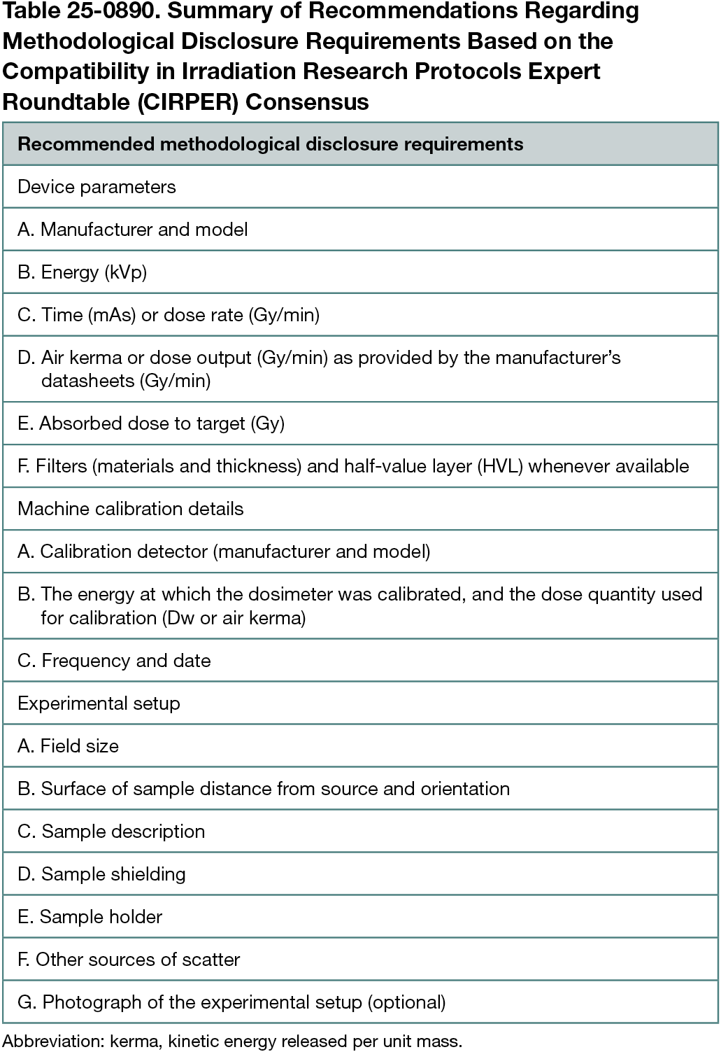 To increase transparency and reproducibility, experts at the meeting agreed on a standard set of disclosure requirements researchers working with x-ray irradiators should include when publishing their work (Table 25-0890). The meeting also resulted in further discussions on how session participants can support CIRPER’s efforts to harmonize the reporting of irradiation protocols and methods.
