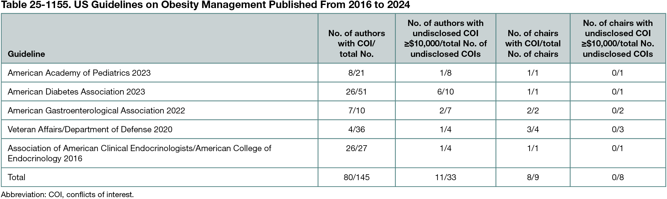 We retrieved 5 CPGs (American Academy of Pediatrics 2023, American Diabetes Association 2023, American Gastroenterological Association 2022, Veteran Affairs/Department of Defense 2020, Association of American Clinical Endocrinologists/American College of Endocrinology 2016) (Table 25-1155). Among 145 authors, 80 (55.2%) received payments from industry agents related to obesity prevention or treatment. Of these, 33 authors (41.3% [22.8% overall]) had undisclosed COIs. Among undisclosed COIs, 11 (33.3%) were greater than or equal to $10,000 and 22 (66.7%) were less than $10,000. Every guideline had at least 1 chair or first author with industry-related COIs. Seven of 9 (77.8%) of these prominent authors did not disclose any COI, though all undisclosed COIs were less than $10,000.