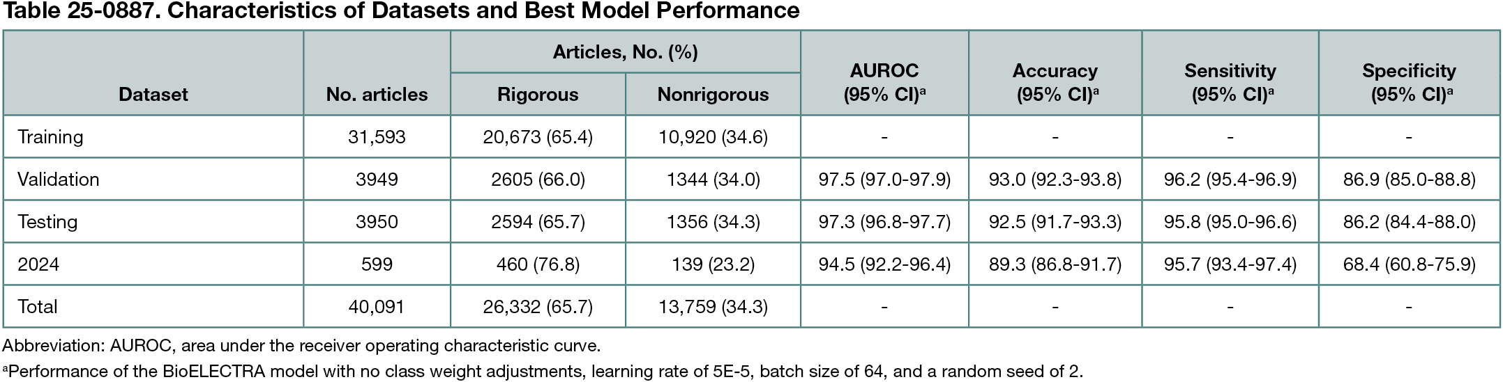 Among 40,091 reviews, 26,332 (65.7%) were considered rigorous and 31,593 were used for training. Of the 630 fine-tuned models, BioELECTRA with no class weight adjustments, learning rate 5E-5, batch size 64, and seed 2 had the lowest validation log loss of 0.1840. Table 25-0887 details the characteristics of the datasets and the model’s performance, achieving >94% area under the receiver operating characteristic curve and >95% sensitivity. In review articles published in 2024, there was a notable drop in specificity and mild degradation in other metrics.