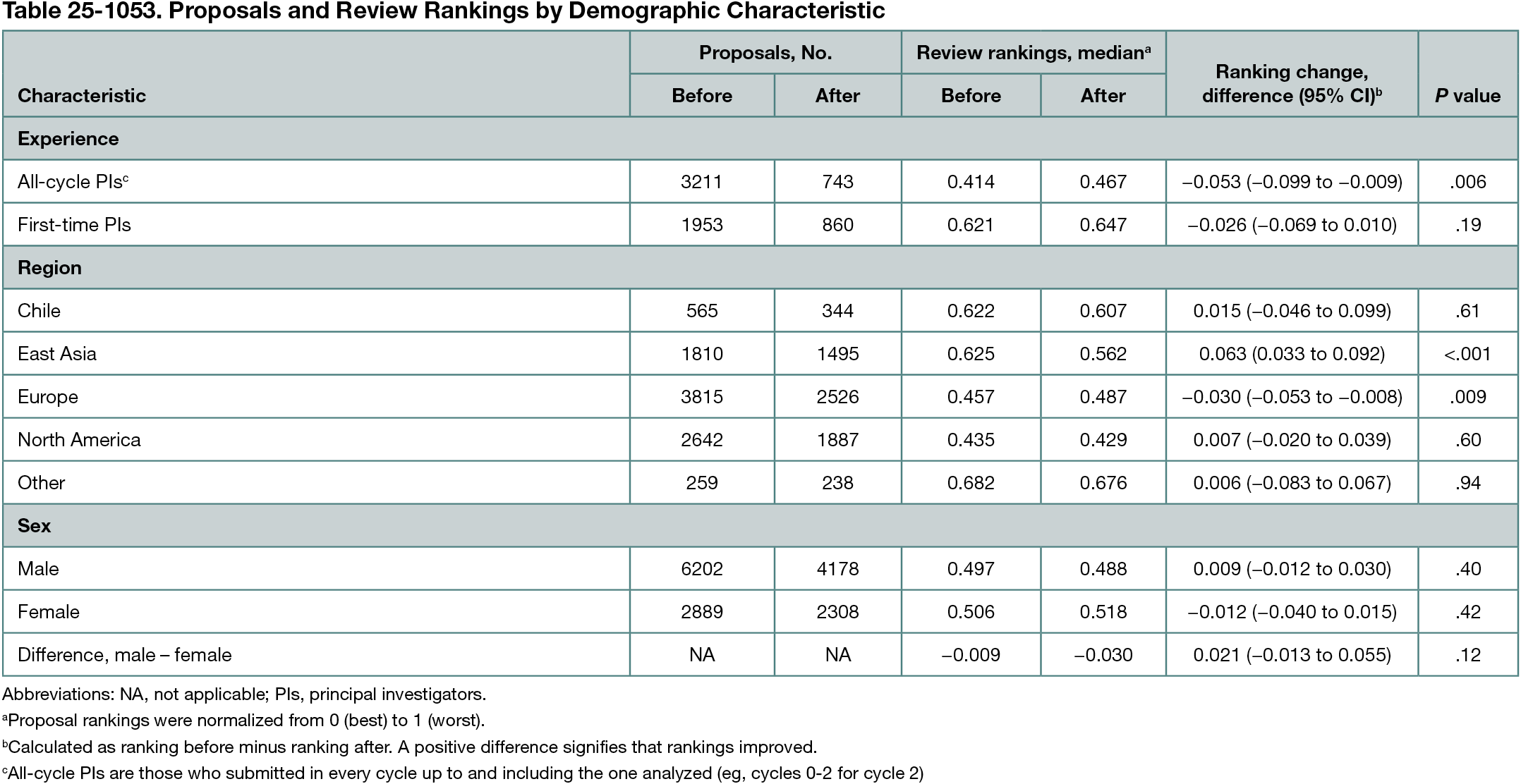 Proposal rankings were normalized from 0 (best) to 1 (worst) for comparability across cycles. Proposal counts by demographic subgroup and review era are reported in Table 25-1053. We compared median normalized rankings between review eras using 10,000 bootstrap samples to generate 95% CIs and 2-sided P values. We observed the following associations: (1) for experience, PIs submitting in all cycles had better rankings during single-anonymous panel review than under dual-anonymous distributed review (P = .006), and first-time PIs ranked lowest in both systems with no significant change in rankings (P = .19); (2) for regional affiliation, East Asian PIs showed improved rankings after the transition (P < .001), rankings for European PIs declined (P = .009) but remained above average, and rankings for PIs from North America, Chile, and other regions did not show significant changes (P > .60); and (3) for sex, no statistically significant differences in rankings were observed between male- and female-led proposals in either review system (P = .12).