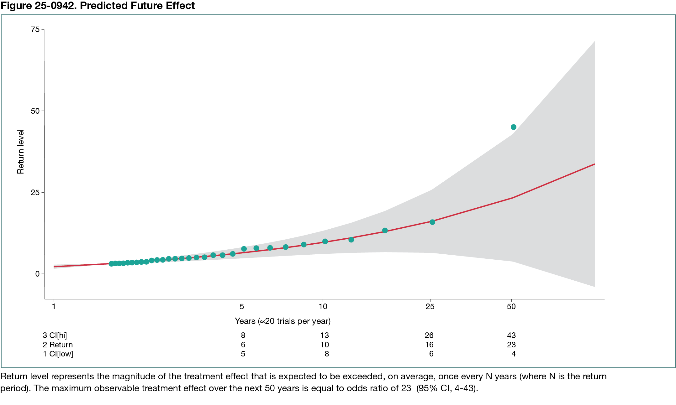 Between 1955 and 2018, a total of 716 RCTs testing 984 experimental vs standard treatments in 349,947 patients were conducted and published by 2022, averaging approximately 20 RCTs per year. The shape parameter of the GPD had positive values, indicating no upper limit on maximum treatment effects. We found that the treatment with the largest effect in the past had an odds ratio (OR) of 45 (95% CI, 2-1008). If effect patterns remain the same and a similar pace of performing RCTs continues, the largest predicted future effect over the next 50 years would be an OR of 23 (95% CI, 4-43) (Figure 25-0942). We estimated a 20% probability of detecting new treatment effects with an OR greater than 50 in the next 50 years. We also found that conducting more RCTs (40 or 60 per year) would double or triple the probability of detecting breakthrough treatments with dramatic effects.