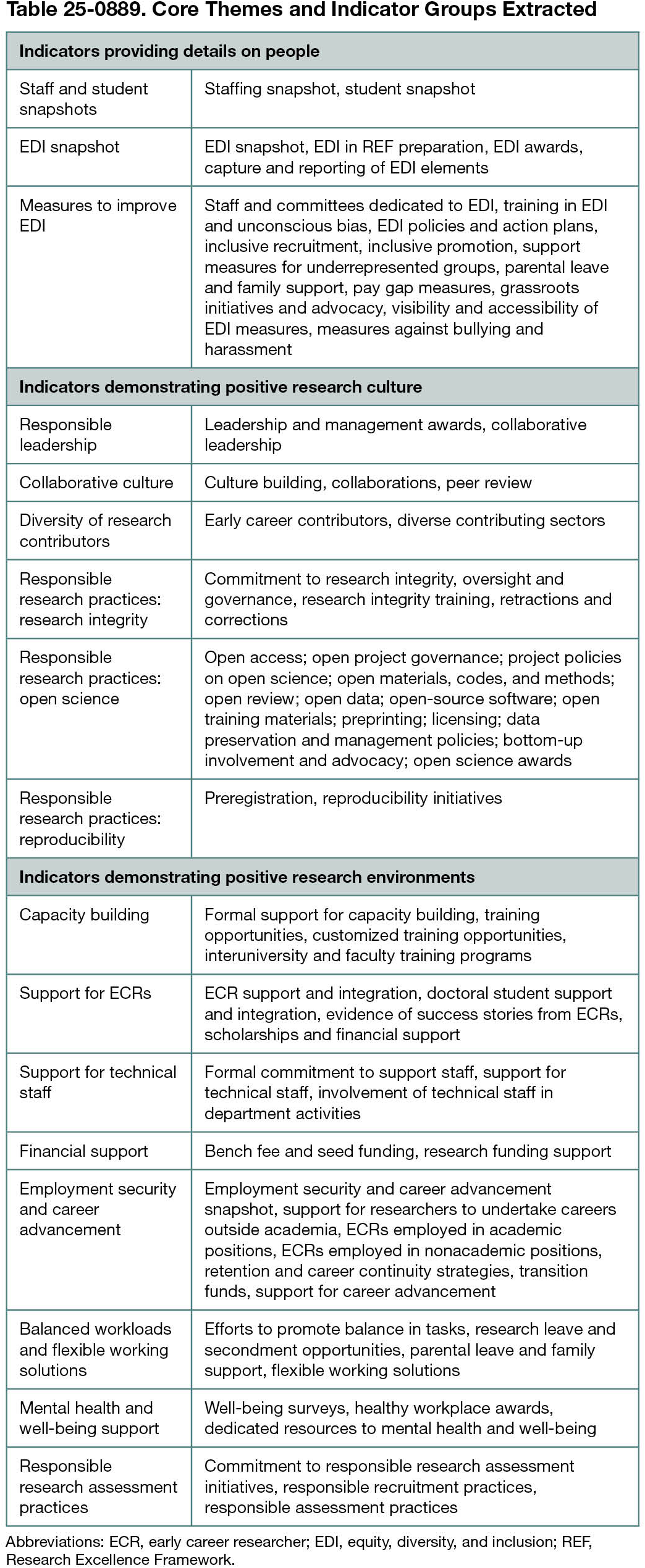 The analysis identified a vast array of elements, which were used to showcase positive research environments. We organized the elements extracted in indicators providing details on people, such as diversity metrics, staff and student characteristics, and measures to improve equity, diversity, and inclusion; indicators demonstrating positive research cultures, such as responsible leadership, collaborative culture, research integrity, and open research; and indicators demonstrating positive research environments, such as capacity-building measures, staff and financial support, employment security and progression, and responsible assessment practices (Table 25-0889). The breadth of indicators identified showcased differences and similarities in how different institutions and units of assessment qualified their research environments.