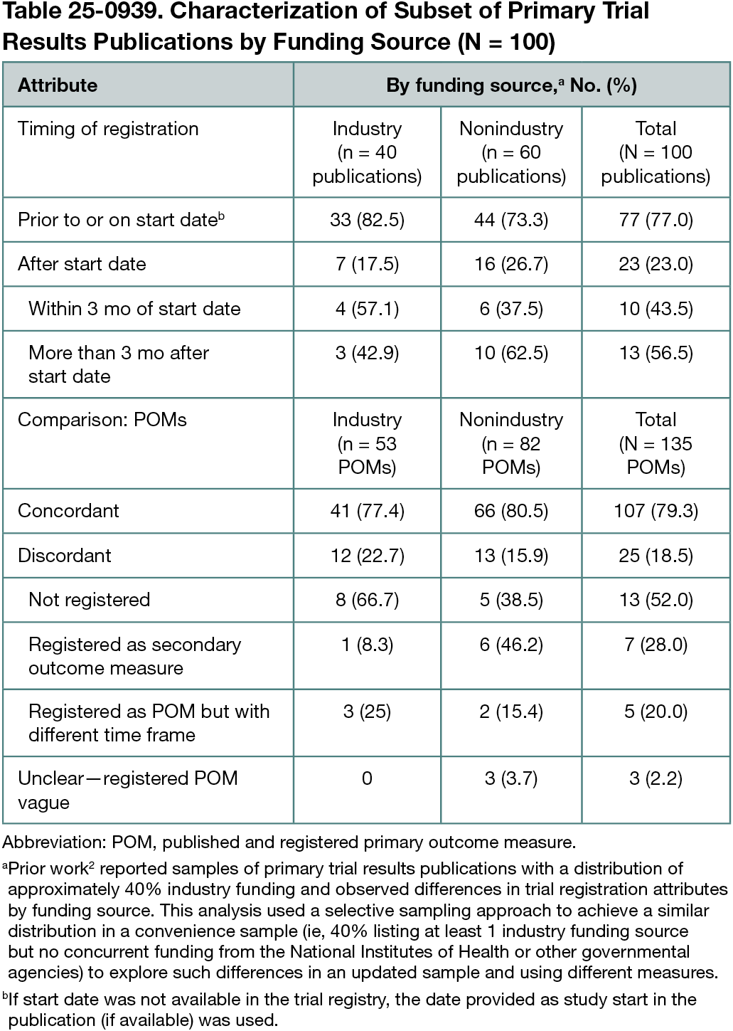 This cross-sectional analysis assessed a convenience sample of primary trial results publications first indexed in PubMed from July to September 2024 that was randomly selected by funding category to reflect a distribution of 40% industry and 60% nonindustry.2 Each article was manually reviewed by 1 author. The journal title, first publication date, and any unique identifier from an ICMJE-recognized registry listed in the abstract or body text were extracted. Publications without trial registry information had their status confirmed via advanced search within the WHO International Clinical Trials Registry Platform (ICTRP). From a random subset of 100 sampled publications listing registry identifiers, again selected randomly for a 40% to 60% funding distribution, 1 author extracted first registration and study start dates from corresponding registration records to determine timing of registration (prospective or retrospective). The author also compared primary outcome measures (POMs) listed in publications and records. The first outcome measure mentioned was used for publications without explicitly identified POMs. Discrepancy codes were adapted from prior work.3 Registered POMs with vague terms (eg, safety) were coded as “unclear.” All data were reviewed independently by a second author and differences resolved by discussion.