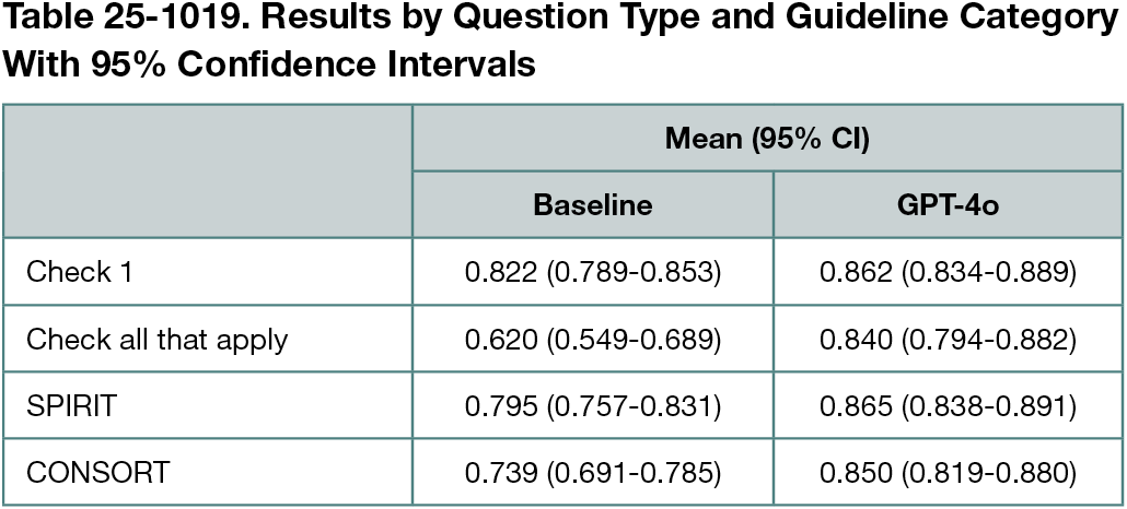 There was no information for some questions in most articles. For example, only 4% reported informed consent materials. Even commonly reported items often lacked critical details (eg, 36% did not specify procedures for monitoring participant adherence to intervention). Interannotator agreement was 0.94 (Cohen κ). F1 score comparison for the GPT-4o model and the baseline is shown in Table 25-1019 (0.856 vs 0.764). The scores ranged from 0.495 to 1 for GPT-4o and from 0.287 to 1 for baseline. Our approach performed comparably on questions related to both the SPIRIT1 and CONSORT2 guidelines, with slightly better results for SPIRIT.