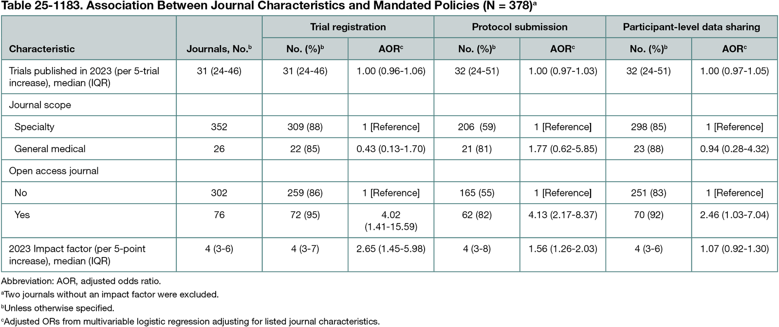 Among 380 included journals, 320 (84%) required trial registration, 11 (3%) recommended it, and 49 (13%) did not mention it. Adherence to a reporting guideline for clinical trials was required by 251 journals (66%), recommended by 74 (19%), and not mentioned by 55 (14%). Trial protocol submission was required by 118 (31%), recommended by 110 (29%), and not mentioned in 152 (40%). Public availability of participant-level datasets was required by 104 (27%), recommended by 218 (57%), and not mentioned by 58 (15%). A description of the data sharing plan was required by 212 journals (55.8%), recommended by 110 (28.9%), and not mentioned by 58 (15.3%). Purely open access journals had a 4-fold higher odds of requiring trial registration (adjusted odds ratio [AOR], 4.02; 95% CI, 1.41-15.59) and protocol submission (AOR, 4.13; 95% CI, 2.17-8.37) and 2.5 times higher odds of requiring public sharing of participant-level data (AOR, 2.46; 95% CI, 1.03-7.04) compared with other journals (Table 25-1183). Each 5-point increase in journal impact factor was associated with a more than 2.5-fold increase in the odds of requiring trial registration (AOR, 2.65; 95% CI, 1.45-5.98) and over 50% increase in the odds of requiring protocol submission (AOR, 1.56; 95% CI, 1.26-2.03). Impact factor was not significantly associated with requiring data sharing. No significant associations were found for journal scope or volume of trials published.