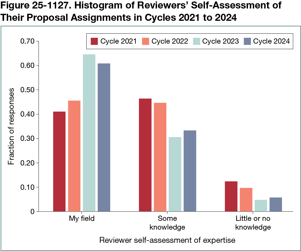 The new method was implemented in 2023, involving 1098 reviewers and 1635 proposals. Similarity scores were validated using survey data from cycles 2021 and 2022. On average, 89% of the reviewers rated their expertise. The median similarity of assignments in which reviewers identified themselves as experts was 0.35 compared with 0.04 for nonexpert assignments, confirming the metric’s reliability. Retrospective application of the similarity metric to cycles 2021 and 2022 using the same LDA model showed that the median similarity increased from 0.20 in 2022, the final cycle of the old algorithm, to 0.71 in 2023, the first cycle of the new algorithm, demonstrating a better alignment between reviewers and proposal assignments. Every cycle, on average, 87% of reviewers rated their expertise level on their assigned proposals. With the new algorithm, the percentage of reviewers identifying themselves as experts increased from 45% to 65%, while self-identified nonexperts decreased from 10% to 5%. This tendency continued in cycle 2024, when the new algorithm was also used (Figure 25-1127). Additionally, the new algorithm eliminated manual reassignments, reducing manual effort time from 3 to 5 days to nearly zero. These findings will be updated with analysis of new data from 2024 and 2025.