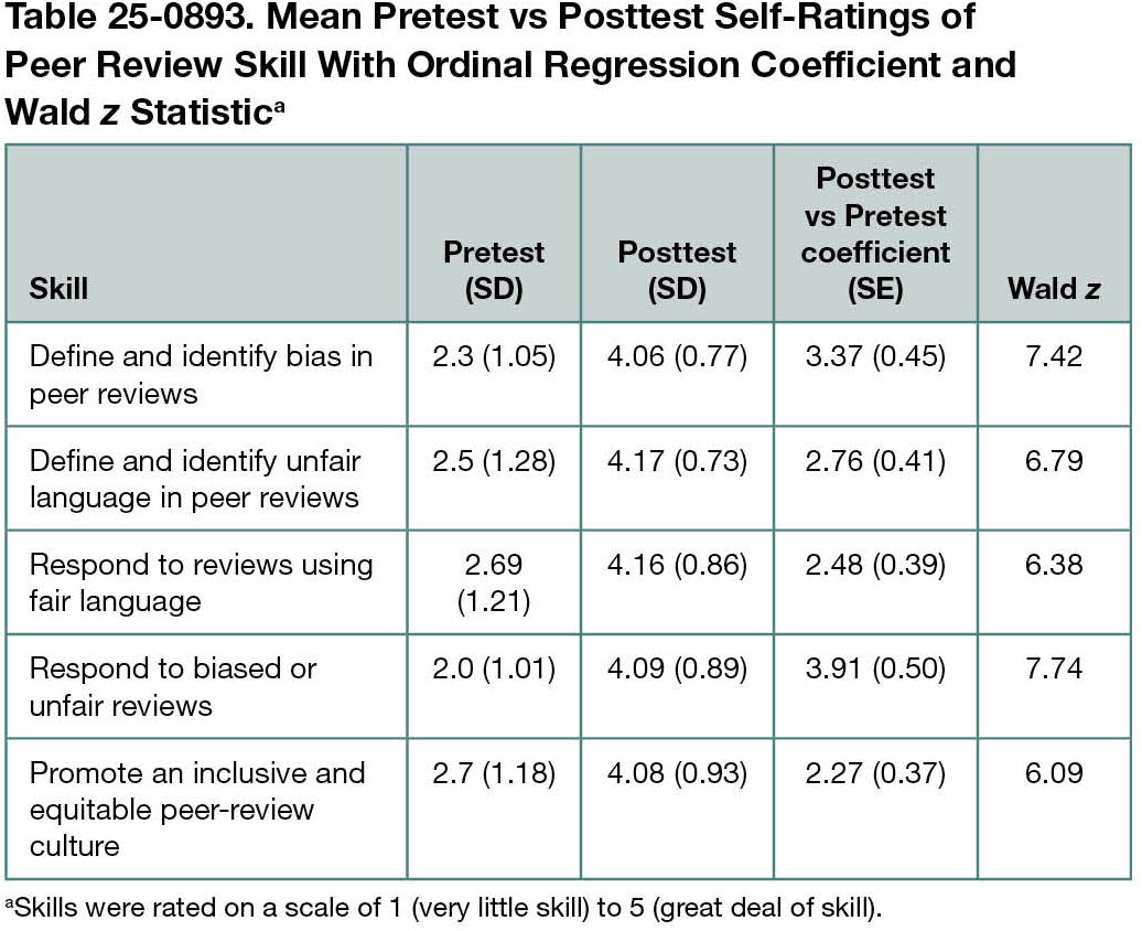 A total of 64 participants (42 PhD students [66%], 10 predoctoral students [16%], 8 postdoctoral trainees [13%], and 4 other trainees [5%]) rated their level of skill for 5 targeted skills. Ordinal regressions showed participants had significantly higher ratings for all skills at posttest. For example, the mean (SD) self-ratings for the skill to respond to biased on unfair reviews increased from 2.0 (1.01) on the pretest to 4.09 (0.89) on the posttest (Table 25-0893).