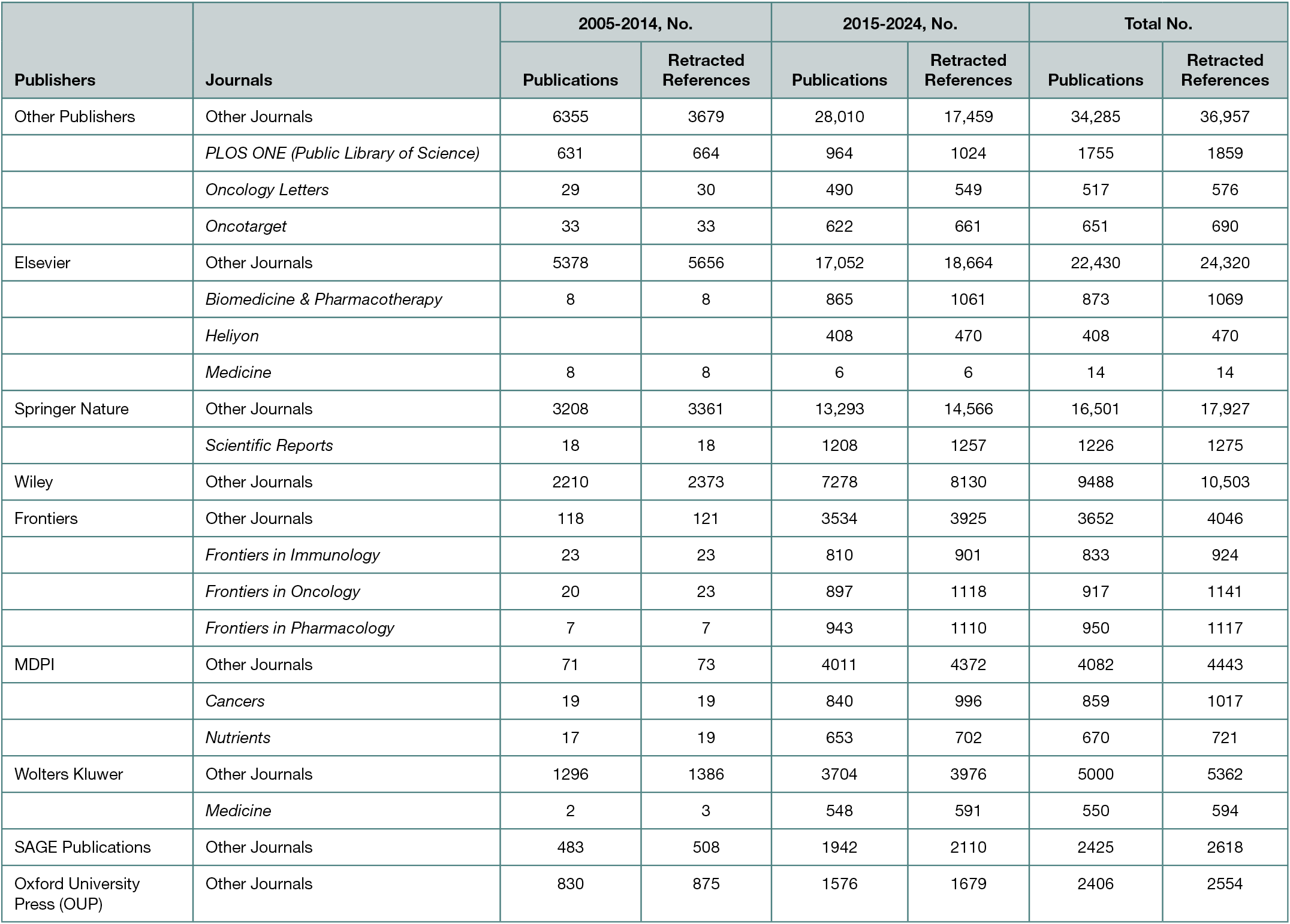 We observed a growing number of publications in the BSC literature that cite retracted publications. In 2005, there were 674 publications referencing 638 retracted publications 688 times. This grew to 13,927 publications referencing 14,214 retracted publications 15,339 times in 2024: a 2066% increase in publications and retracted references and a 2228% increase in retracted publications cited. This compared to an increase over the same period of 267% for publications in BSC (from 368,338 to 983,837) and 390% in citations (8,495,152 to 33,143,231). This is an increase in the proportion of publications with retracted references from to 0.18% to 1.69% of all BSC publications. The number of retracted publications referenced doubled since 2019. The connection between journal and publisher reflected the ownership relationship as of approximately January 2025. The journals in which post-retraction referencing of retracted literature occurred are many (7225 distinct journals, 17%), but over half of the publications (57,292 of 110,492) are currently owned by four major publishers: Elsevier (23,725; 21%), Springer Nature (17,727; 16%), Wiley (9488; 9%), and Frontiers (6352; 6%).(Table 25-1151)