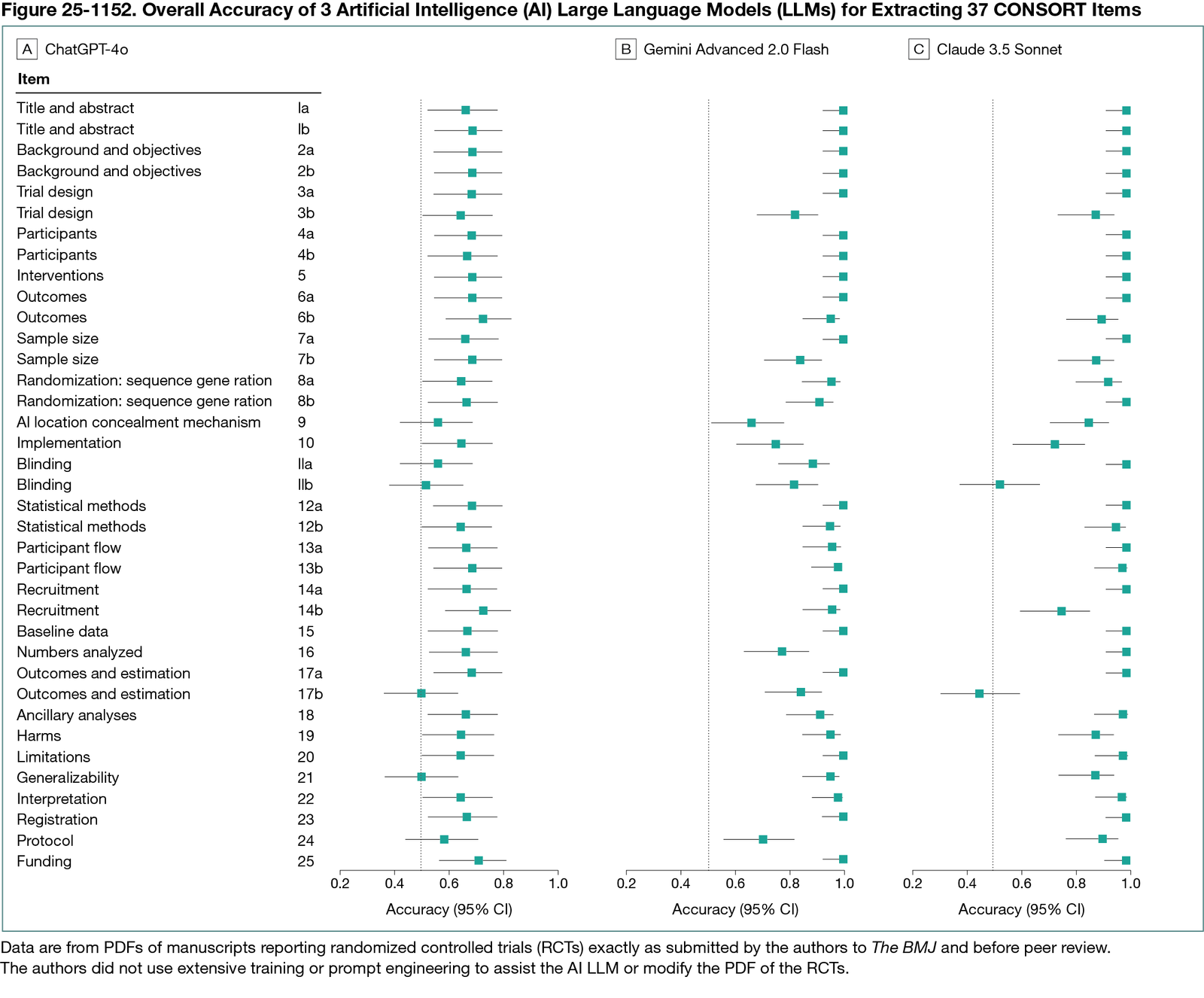 Of the 1850 CONSORT items, ChatGPT provided decisions for 1776 (96.0%); 1159 of these were in agreement with human extraction (overall accuracy, 65.3% [95% CI, 63.0%-67.5%]; sensitivity, 61.3% [95% CI, 55.0%-67.3%]; specificity, 65.9% [95% CI, 63.5%-68.3%]). Gemini provided decisions for 1629 items (88.0%), of which 1521 were in agreement with human extraction (accuracy, 93.4% [95% CI, 92.1%-94.5%]; sensitivity, 97.6% [95% CI, 94.8%-99.1%]; specificity, 92.6% [95% CI, 91.1%-94.0%]). Claude provided decisions for 1480 items (80.0%), of which 1375 were in agreement with human extraction (accuracy, 92.9% [95% CI, 91.5%- 94.2%]; sensitivity, 56.1% [95% CI, 49.3%-62.8%]; specificity, 99.4% [95% CI, 98.8%-99.7%]). Accuracy of LLMs was particularly low for certain CONSORT items (Figure 25-1152). There were no significant associations between PDF characteristics and AI and human disagreements. Trial PDFs were a mean of 49 pages and 17,268 words. LLMs were able to compile visually acceptable CONSORT checklists on the first iteration in 76.7% (115 of 150) attempts: ChatGPT for 40 RCTs, Gemini for 36 RCTs, and Claude for 39 RCTs. Generation of a CONSORT checklist required a mean of 75 seconds, 38 seconds, and 47 seconds for ChatGPT, Gemini, and Claude, respectively (range, 16-249 seconds).