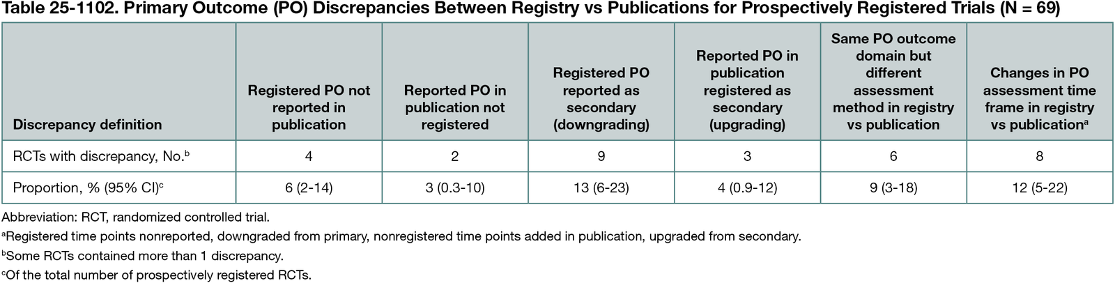 In a random sample of RCTs published in 2024 across clinical specialties, approximately half were prospectively registered and approximately one-third of these contained substantial changes between registered and reported primary outcomes.
