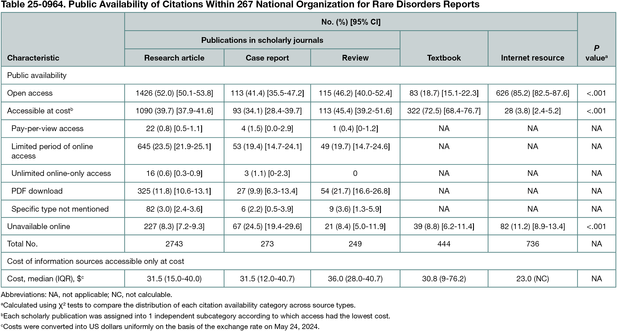 Among 1333 NORD rare disease reports available as of February 2024, 267 were randomly selected for study. These 267 reports included 4445 citations to 3506 unique information sources; the median (IQR) number of citations per report was 15 (11-20), including 9 (5-13) research articles, 0 (0-1) case reports, 0 (0-0) review articles, 1 (0-3) textbook, and 2 (1-4) other internet resources. Among 3506 unique information sources cited, 1750 (49.9%) were open access, 1381 (39.4%) were accessible at cost, and 375 (10.7%) were unavailable online (Table 25-0964). Among citations accessible only at cost, the median (IQR) cost was $31.5 ($15.0-$40.0), whereas the total cost per report for all citations accessible only at cost was $167.7 ($82.0-$258.7). The overall proportion of citations published in scholarly journals available as open access increased from 30.0% (258/860) prior to 2001 to 79.8% (95/119) from 2021 onwards (P < .001).