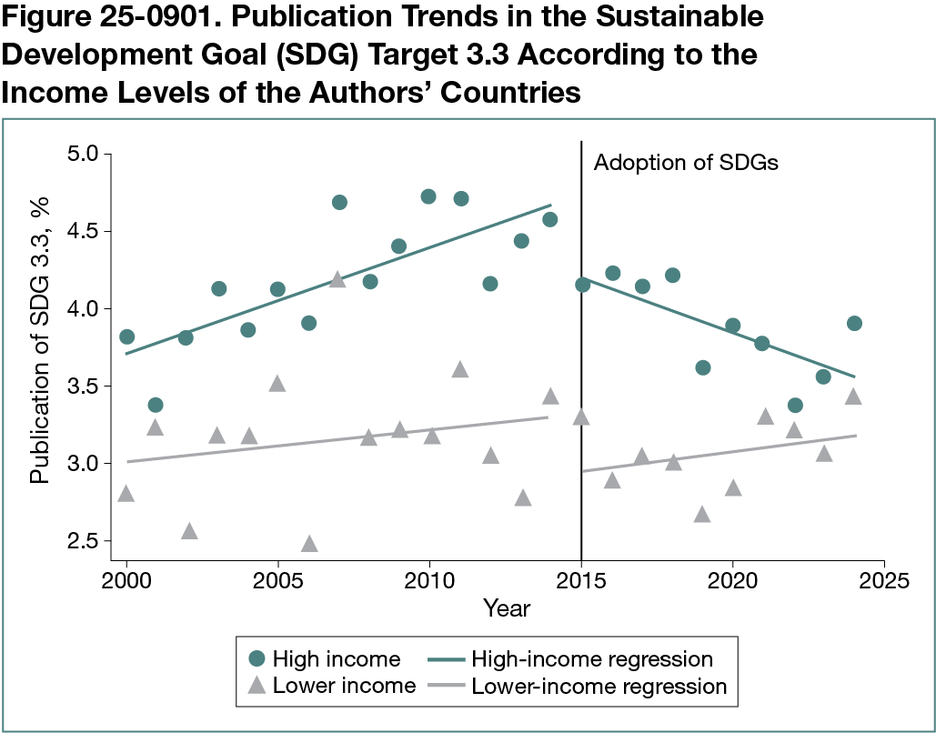 Three hundred fifty-five journals were included, which published 1,313,671 articles, of which 49,687 (3.8%) addressed SDG 3.3 from 2000 to 2024 and 37,521 (2.9%) were published by authors from high-income countries and 12 166 (0.9%) were published by authors from low- and middle-income countries. Between 2000 and 2015, there was an overall growing trend in published papers related to SDG 3.3 (β, 0.47; 95% CI, 0.18-0.76; P = .003), which was more pronounced in developed countries (β, 0.69; 95% CI, 0.38-1.00; P < .001), while the trend from developing countries was not significant (β, 0.21; 95% CI, −0.19 to 0.06; P = .30) (Figure 25-0901). After the adoption of SDGs in 2015, SDG 3.3 publications started to decrease until 2024 (β, −1.00; 95% CI, −1.54 to −0.47; P = .001) in a similar pattern in highincome countries (β, −1.40; 95% CI, −2.00 to −0.81; P < .001), whereas a nonsignificant increase was observed in lower-income countries (β, 0.05; 95% CI, −0.05 to −0.73; P = .89) in the same period.