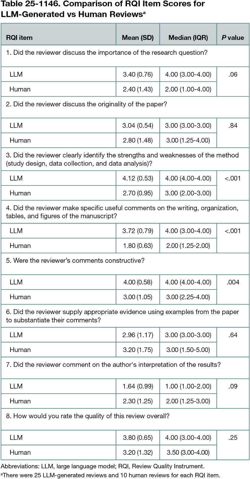 A comparative study of peer reviews produced by LLMs (GPT4o, GPTo3, Claude 3.5, Gemini 1.5 Pro, and Gemini 2.0 Flash) compared with 2 human peer reviews for research submissions between May 2024 and June 2025. Manuscripts were uploaded to Google’s Vertex AI, a private and secure BMJ Group workspace for using LLMs; the same prompt was used for all submissions (single-shot prompting). An experienced editor performed the ratings of all LLM and human reviews using the Review Quality Instrument (RQI),3 a tool for assessment of review quality comprising 8 questions, each on a 5-point Likert scale. Secondary outcomes include a comprehensiveness score, based on elements of the manuscript that the reviews focused on, and whether they were evaluative in nature. Additionally, once the first decision has been made on the manuscripts, we plan to invite authors to complete a survey about their perceptions of both the LLM review reports and the peer reviewer reports for their manuscripts. We also plan to have a second editor perform the ratings and compute interrater agreement. Reviews produced by LLMs are not included in the decision-making for the manuscripts. Wilcoxon rank sum tests were used to compare LLM and human scores for each RQI item.