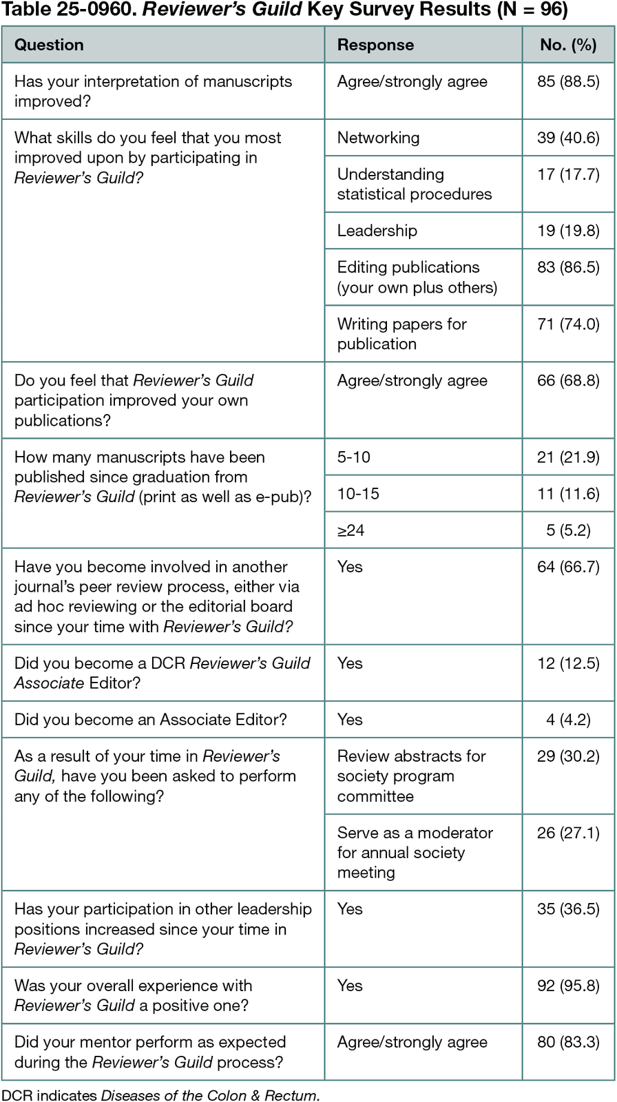 Ninety-six of the 182 graduates (52.8%) responded. Key survey responses are shown in Table 25-0960. Nearly all respondents reported enhanced understanding of the editorial process. Eighty-eight respondents (91.7%) had a generally positive experience and believed that the program improved the quality of their own publications and interpretation of others’ work. Seventeen respondents (17.7%) said they had improved understanding of statistical principles. Thirty-seven respondents (38.5%) published 5 or more manuscripts since graduating from the Reviewer’s Guild, 64 (66.7%) became involved with other journals (as ad hoc reviewers or editorial board members), and 16 (16.7%) of the highest performers received Reviewer’s Guild board or full editorial board appointments to the journal.