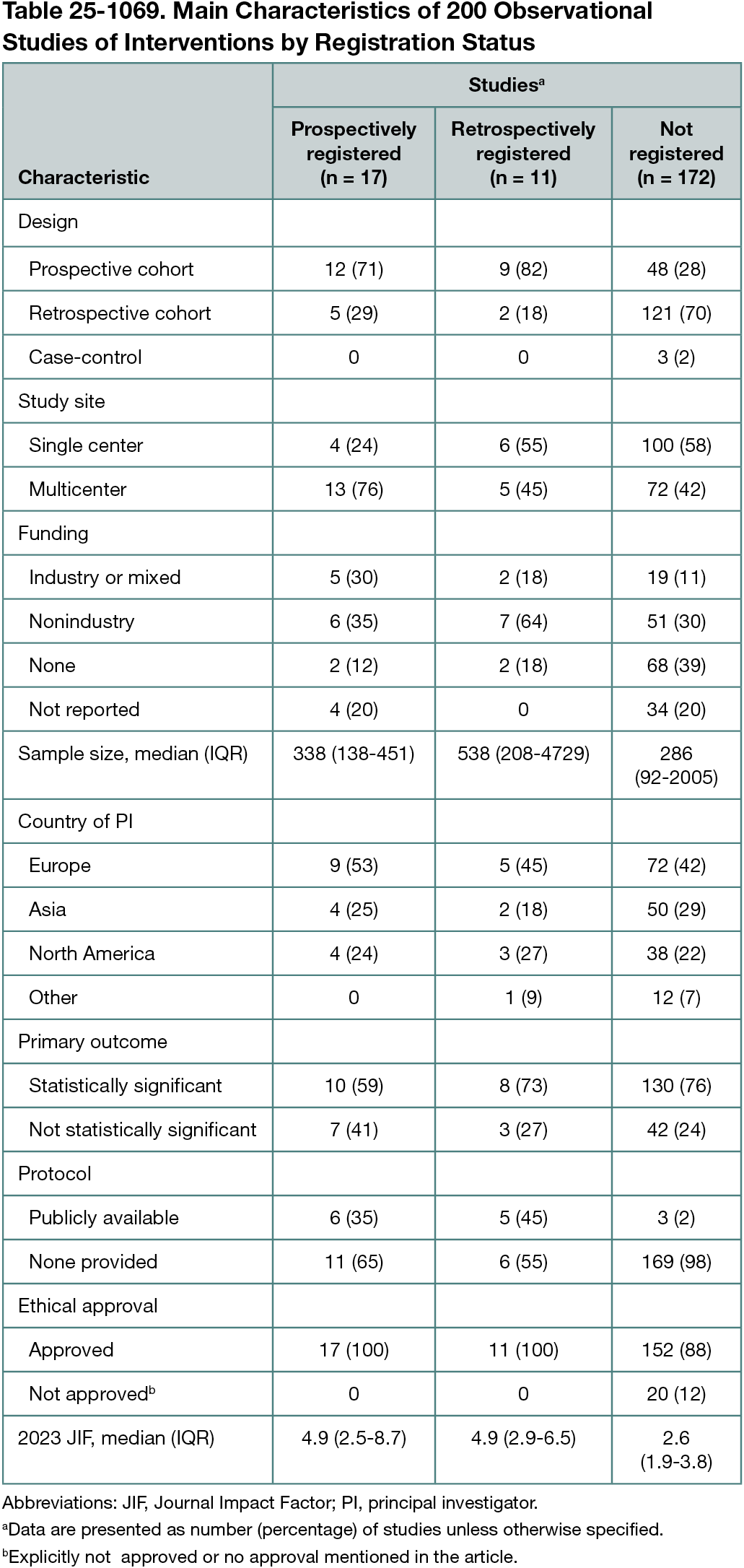 Among 1100 screened studies, 200 were included: 69 and 128 cohort studies with prospective and retrospective data collection, respectively, and 3 case-control studies. In total, 28 (14%) were registered, and 17 of these (61%) were prospectively registered (<1 month of their start date) (Table 25-1069). Prospective design and protocol availability were positively associated with registration (retrospective vs prospective cohort: odds ratio [OR], 0.19 [95% CI, 0.07-0.54]; P = .002; no public protocol vs public protocol: OR, 0.04 [95% CI, 0.01-0.23]; P < .001). The survey response rate was 23% (46 responses); 60% of authors supported registration, although many only when registration was deemed relevant. Identified barriers included lack of journal requirements for registration (56%) and limited resources (62%). None of the journal policies explicitly required registration of observational studies of interventions, while 12 (30%) encouraged it. Journals that encouraged registration had a higher 2023 Journal Impact Factor and more frequently encouraged public protocols. Editors had divergent opinions on registration. While some considered it to be worthwhile, just as many questioned the added value.