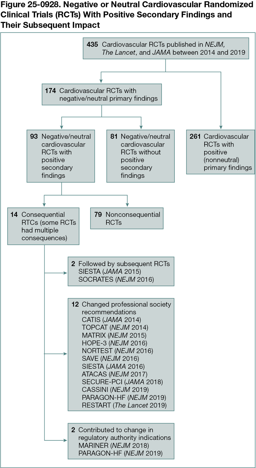Overall, 435 cardiovascular RCTs were identified; the median time from the index trial to December 2024 was 7.5 (IQR, 5.5-9.5) years. Of these 435 RCTs, the primary outcome(s) were not met in 174 trials (40.0%), of which 93 (53.4%) had at least 1 positive secondary finding. Among these trials, 51 (54.8%) had only positive secondary outcomes, 20 (21.5%) had only positive findings in subgroup analyses, and 22 (23.7%) had positive findings in both secondary outcomes and subgroup analyses. Among the 93 negative/neutral RCTs with positive secondary findings, 14 (15.1%) were consequential: subsequent RCTs were performed due to positive secondary findings for 2 trials; the secondary results from 12 RCTs contributed to changes in professional society recommendations; and 2 trials contributed to changes in labeled indications (Figure 25-0928).