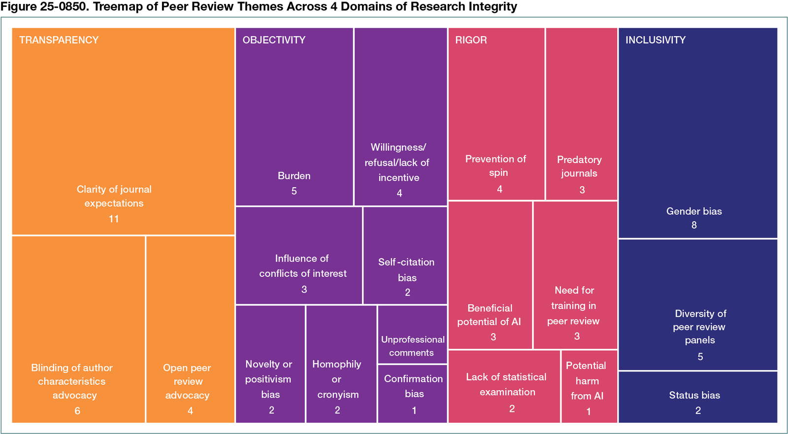 Fifty-three papers were included from a total of 1680 citations generated by literature searches. Relevant themes (n = 20) regarding the challenges of peer review, ordered by prevalence, were reviewed for thematic content across the 4 domains (Figure 25-0850). Inclusivity included gender biases (n = 8), status bias (n = 2), and diversity of peer review panels (n = 5); transparency included clarity of journal expectations (n = 11), open peer review advocacy (n = 4), and blinding of author characteristics (n = 6); rigor included predatory journals (n = 3), prevention of spin (n = 4), lack of statistical examination (n = 2), potential benefits of artificial intelligence (n = 3), need for training in peer review (n = 3), and potential harms from artificial intelligence (n = 1); and objectivity included willingness/refusal/lack of incentive (n = 4), burden (n = 5), influence of conflicts of interest of reviewers (n = 3), unprofessional comments (n = 1), self-citation bias (n = 2), novelty or positivism bias (n = 2), confirmation bias against innovative research (n = 1), and homophily (preference for shared characteristics of authors) or cronyism (n = 2).