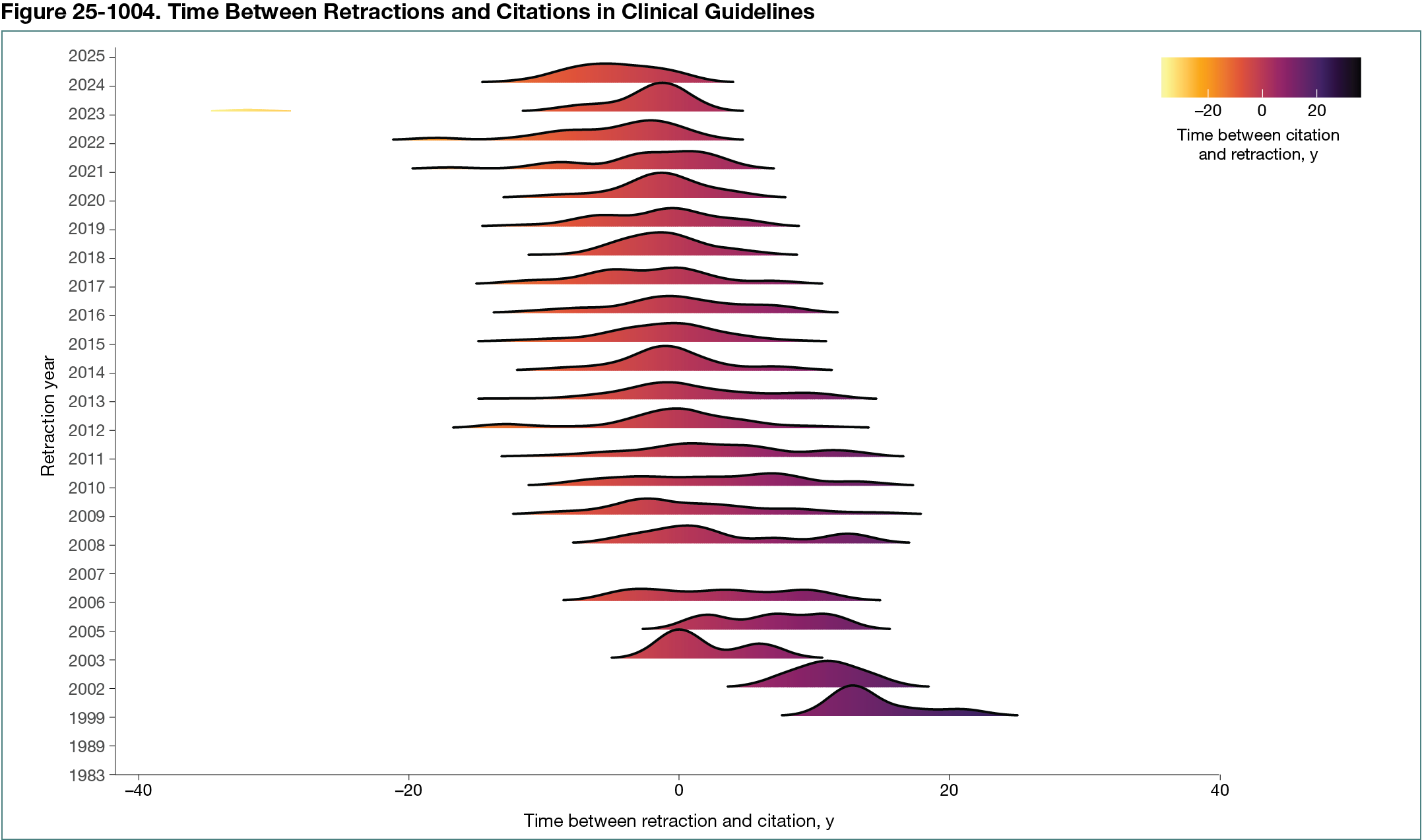 We considered publications cited in the year of retraction to be preretraction citations. We found 487 guidelines containing 596 references to 319 publications that had been retracted after citation. Of these, 179 guidelines (37%) referenced 134 retracted publications 204 times within 5 years after retraction (Figure 25-1004).