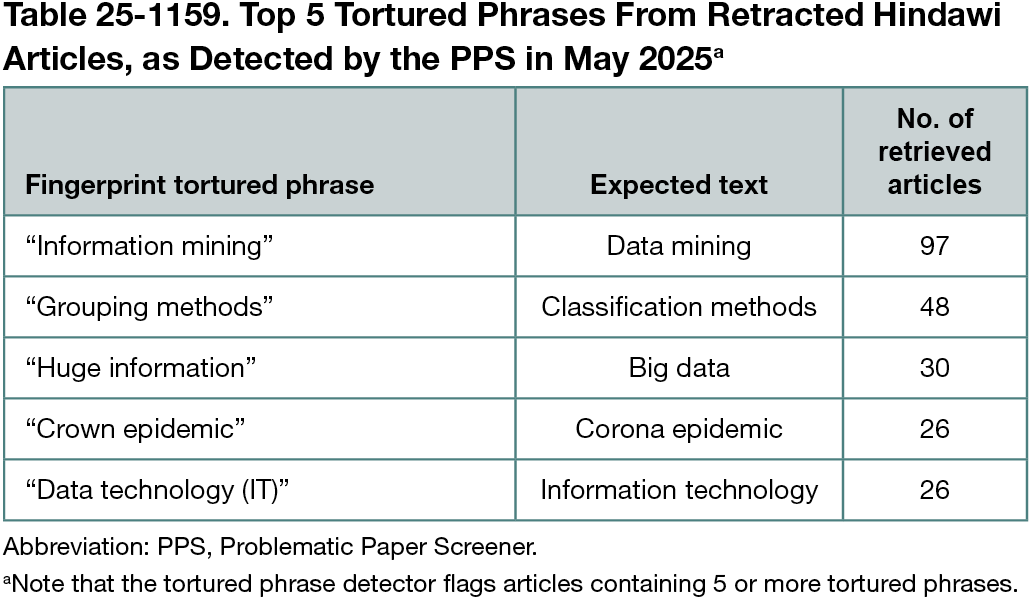 As of May 2025, we designed an algorithm that uses regex based on the PPS fingerprints list in the database to capture different forms of tortured phrases, such as “man-made consciousness,” “profound learning AND deep learning,” and “128 pieces”~5’ [128 bits] (ie, a tortured phrase with components in a 5-word sliding window). This approach is independent from search engines, as it matches fingerprints against the textual content of each article, ignoring their metadata, figure and table contents (including captions), and references. We benchmarked this new approach on the Hindawi extensible markup language (XML) corpus, which contains several hundred articles with tortured phrases, focusing on articles published from 2020 to 2022—the period with the most PPS-flagged articles (n = 3400).