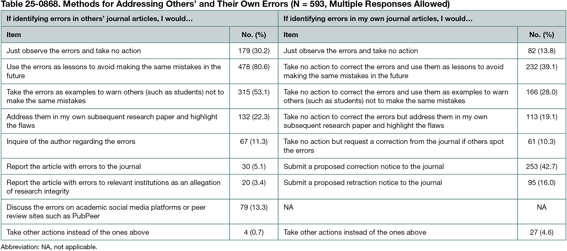 The participants reported a higher frequency of identifying errors in others’ articles than those in their own (t = 17.88; 95% CI, 0.35-0.43; Cohen d = 0.67; P < .001). Regarding identifying others’ errors, 22 items had a mean frequency above the theoretical mean of 2.5, in the categories of occasionally and seldom. The item with the highest frequency was spelling errors/omissions, followed by errors in the understanding or application of theory. For identifying one’s own errors, only the item spelling errors/omissions reached the theoretical mean of 2.5. The other 33 items, such as misunderstanding of previous research and errors in understanding theory application, ranged from 2.34 to 1.92, corresponding to seldom and never. In terms of addressing errors (multiple responses allowed; see Table 25-0868), 478 participants (80.6%) indicated that if they identify others’ errors, they would use them “as lessons to avoid making the same mistakes in the future,” 315 (53.1%) would take the errors “as examples to warn others,” and 179 (30.2%) would “just observe the errors and take no action.” As for addressing their own errors, 253 participants (42.7%) would “submit a proposed correction notice to the journal,” 232 (39.1%) would “take no action to correct the errors and use them as lessons,” 166 (28.0%) would take no action and use the errors “as examples to warn others.”