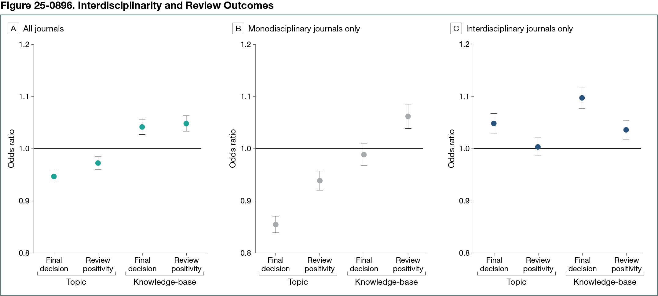 The marginal effect of a 1-SD increase in knowledge-base interdisciplinarity was a 0.9 (0.7) percentage point higher acceptance (positive review) probability, while a 1-SD increase in topic interdisciplinarity corresponded to a 1.2 (0.4) percentage point lower acceptance (positive review) probability. Interactions revealed that high knowledge-base interdisciplinarity attenuated the negative relationship between topic interdisciplinarity and acceptance. We did not see a symmetric effect when high knowledge-base interdisciplinarity was accompanied by high topic interdisciplinarity. When disaggregating model results by journal interdisciplinarity according to the publisher’s 2022 product catalogue,3 journals categorized by the publisher as interdisciplinary or multisubject had positive associations between both types of interdisciplinarity and evaluation outcomes, whereas monodisciplinary journals had negative associations. Our results were robust to the inclusion and transformation of manuscript and team covariates.