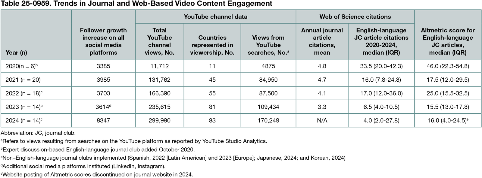 We performed a 7-year (2018-2024) retrospective cohort study of JC video-based educational content provided by DCR with respect to journal website and social media access following STROBE guidelines.3 We examined efforts toward global engagement, including addition of journal-specific non–English-language (2 Spanish, 1 Korean, and 1 Japanese) discussions. Analyses of 4 popular social media platforms’ native analytics reporting and website engagement data examined viewer demographics (age, language, viewing country, and traffic source) and journal web-based interaction (number of views, number of unique visitors, and country of access) by month and year, trends in individual JC videos, and overall page engagement. We compared the median number of citations of JC articles (cumulative Web of Science citations) and their Altmetric scores (indicating article attention received) with mean citations of DCR articles per year.