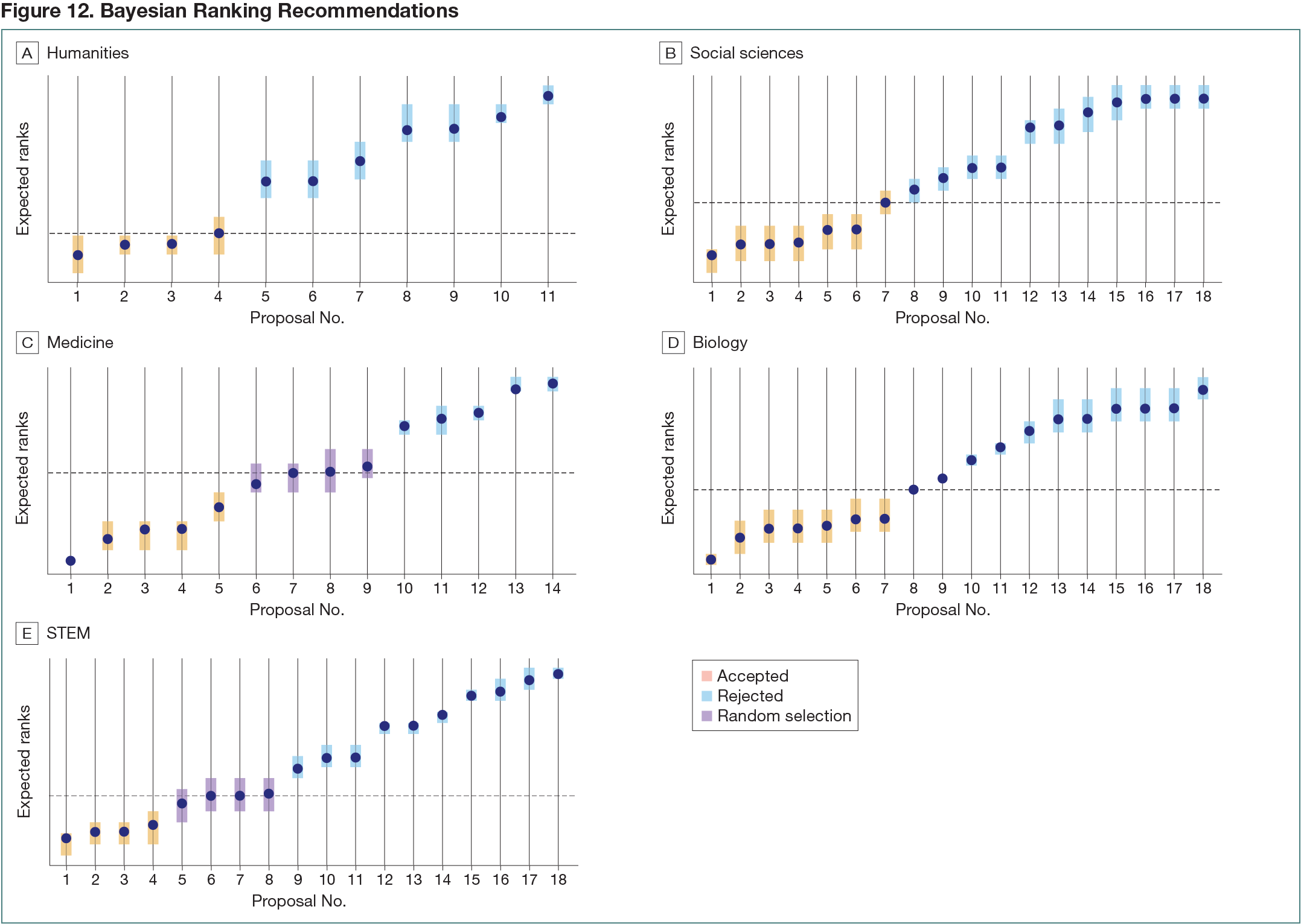 The approach was simulated in the Swiss National Science Foundation (SNSF) early career fellowship scheme call of February 2020. A total of 181 fellowship grants were submitted to 5 disciplinary panels—humanities (23 fellowship grants), social sciences (38), medicine (35), biology (35), and STEM (50); 79 were discussed in the panel, and 32 were funded (Figure 12). A funding line was drawn based on the available budget. A random selection group was identified for 2 panels: medicine and STEM. Applications to other funding schemes will be presented.