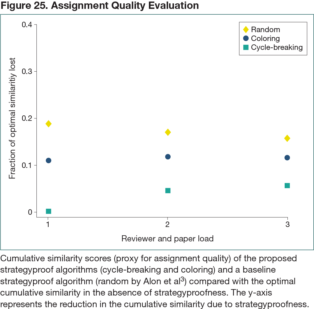 New computational methods to address this problem were developed. The methods build on a prior method for strategy-proof reviewer assignment by Alon et al.3 Their method randomly partitions reviewers into 2 groups and assigns reviewers to review papers authored by reviewers in the other group. Their method then accepts for publication an equal number of papers from each group, thus guaranteeing that no reviewer can influence the outcome of their own papers by manipulating the reviews they provide (ie, “strategyproofness”). The methods proposed in the present work more carefully choose the partition of reviewers to maximize an assignment quality objective, while still satisfying strategyproofness. Large venues frequently consider such an assignment quality objective when using artificial intelligence to assign reviewers.2 The assignment procedure first computes a similarity score between every reviewer-paper pair as a proxy for assignment quality and then assigns reviewers to papers in a manner that maximizes the cumulative similarity score of the assigned reviewer-paper pairs subject to load constraints. The proposed methods aim to choose the highest-similarity assignment subject to the strategyproofness guarantee. The strategyproofness constraint could reduce the cumulative similarity score of the assignment, and this metric was empirically evaluated. This evaluation was performed on data from the International Conference on Representation Learning 2018, a top conference in artificial intelligence that reviewed 911 full papers and was a terminal venue of publication. The optimal cumulative similarity score of the assignment in the absence of strategyproofness was computed and compared with that obtained under the proposed algorithms, as well as the aforementioned baseline algorithm.3