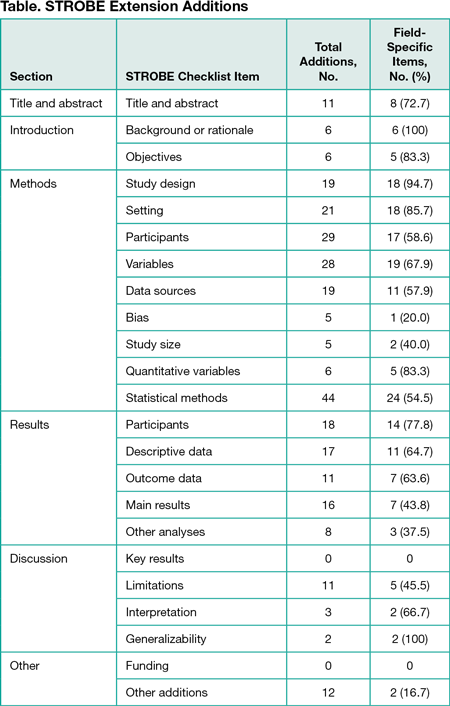 A total of 297 additions were made across 13 STROBE extensions, with 36.7% of items classified as nonspecific (Table). The Methods section of STROBE contained the top 5 areas changed: statistical methods (44 additions; 45.5% nonspecific), participants (29 additions; 41.4% nonspecific), variables (28 additions; 32.1% nonspecific), setting (21 additions; 14.3% nonspecific), and study design (19 additions; 5.3% nonspecific). The items with the largest percentage of nonspecific recommendations were other additions (83.3%), bias (80.0%), other analyses (62.5%), and study size (60.0%). The quality of extensions was variable, with a range of 25% to 100% field-specific recommendations.