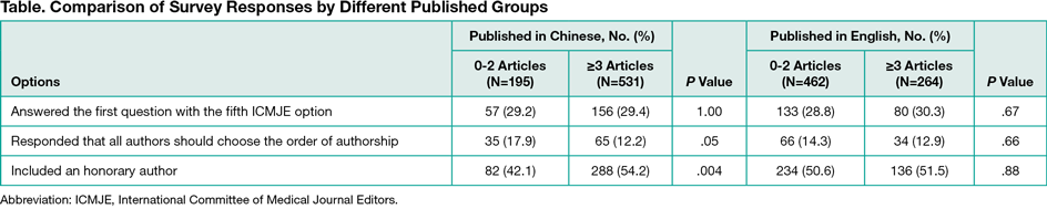 Among the 935 clinical investigators and medical writers from throughout mainland China invited to particiapate, 737 (78.8%) responded to the questionnaire. Of these, 726 (98.5%) provided usable responses. Regarding the first question on authorship criteria, 213 respondents (29.3%) gave the correct answer (the fifth option) and an additional 174 respondents (24.0%) indicated all first 4 options. Combined, 387 (53.3%) provided correct answers confirming an understanding of ICMJE criteria for authorship. Of the 339 respondents (46.7%) who did not select answers that demonstrated an understanding of the complete authorship criteria, 322 (95.0%), 254 (75.0%), 5 (1.5%), and 219 (64.6%) respondents chose the first to fourth options, respectively. There were no significant differences between the numbers of authors who published 0 to 2 articles and 3 or more articles in Chinese vs English-language journals. Only 100 respondents (13.8%) chose the option that all the authors should decide the order of authors, and there was no difference between the 2 groups. A total of 370 respondents (51%) indicated that they included someone who did not contribute to their work as an author (honorary author); this was reported more frequently by authors who published 3 or more articles vs 0 to 2 articles in Chinese journals (54.2% vs 42.1%, P = 0.004) (Table).