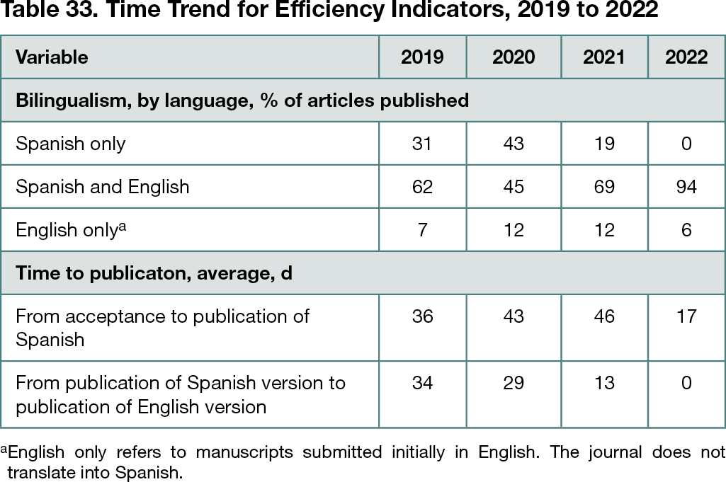 Nine months after implementing the first component of the intervention, the outcomes were full bilingualism, shorter times from acceptance to publication of the article, and simultaneous publication of the Spanish and English versions (Table 33). The second and third components were in the final stages, and full deployment was expected by July 2022. Once 100% rollout of the bilingual copyediting software was achieved, built-in recycling of nontranslatable manuscript sections such as metadata, keywords, abstracts, and references, would reduce inconsistencies between versions and unburden the human translators. Because deployment was still partial, the journal did offline technical editing of both languages simultaneously, thus ensuring the accuracy of both versions. The journal was financially sustainable despite the significant effort and rollout.