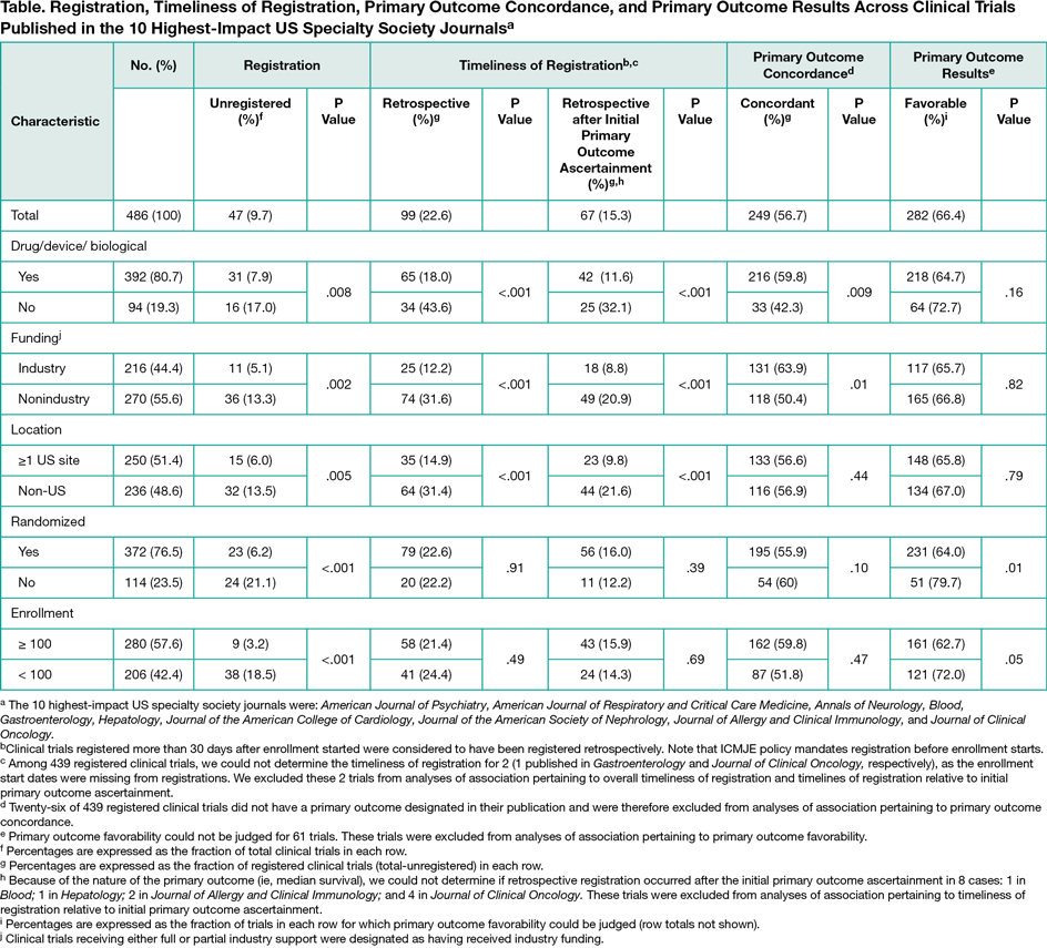 Among 6869 original research reports, we identified 472 articles reporting the primary results for 486 clinical trials. Of these 486 trials, 47 (10%) were unregistered, with proportions differing across journals. Among 439 registered clinical trials, 340 (77%) were registered prospectively and 99 (23%) retrospectively. Sixty-seven (15% of all registered trials) of these 99 retrospectively registered trials were registered late enough to have potentially permitted premature examination of primary outcome data ascertained among participants enrolled at inception. Among 413 clinical trials that registered and published at least 1 primary outcome, 109 (26%) published primary outcomes that differed from those first registered and 55 (13%) registered primary outcomes that were too poorly specified to permit comparison with published outcomes. Unregistered clinical trials were more likely to report favorable results than were registered clinical trials (89% vs. 64%; P = .004) irrespective of registration timing. FDA-regulated interventions, US-based studies, and industry funding were each associated with timely registration (Table).