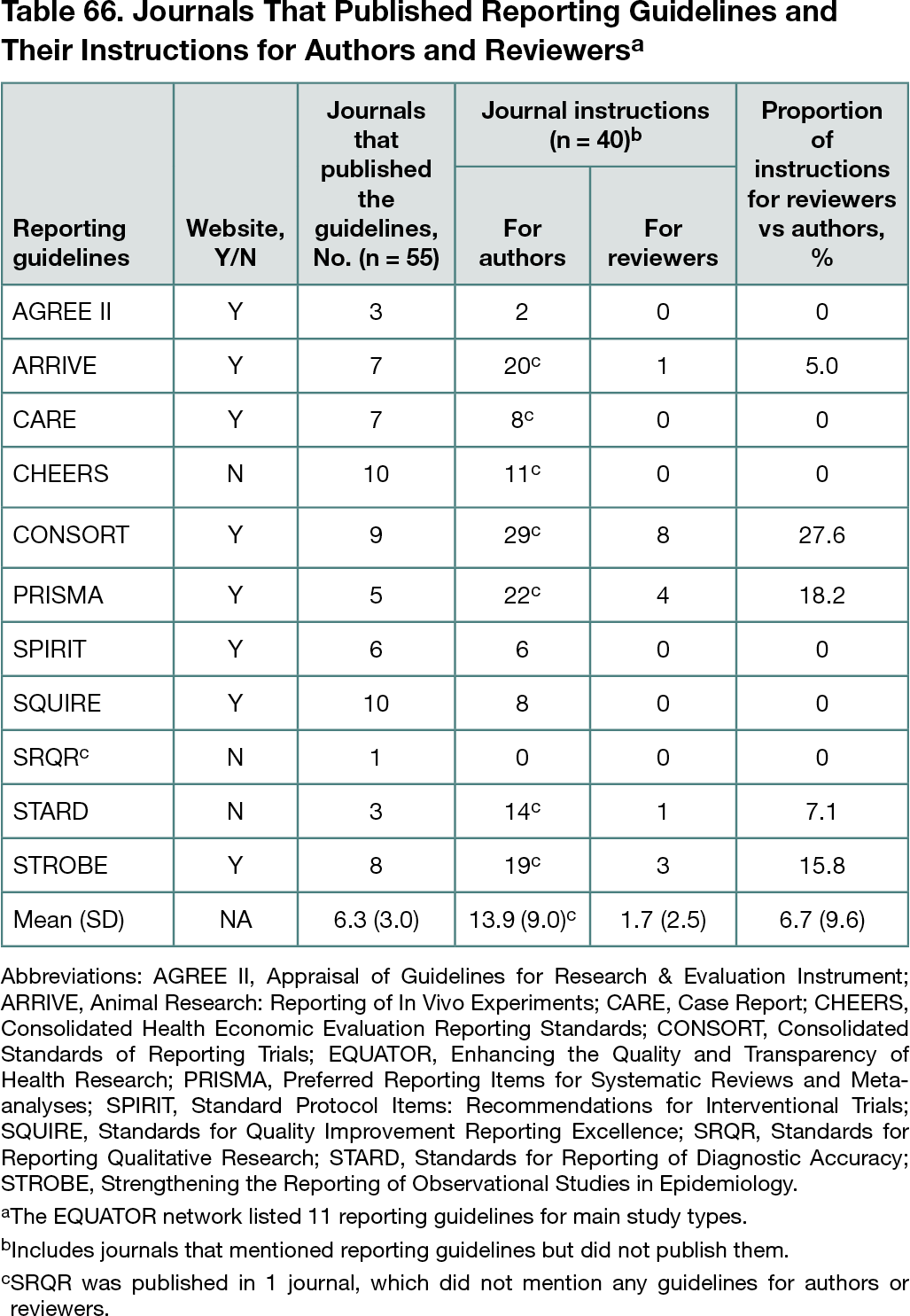 The journals that endorsed specific guidelines ranged from 24 for Standards for Quality Improvement Reporting Excellence (SQUIRE) reporting guideline–friendly journals to 1047 for Animal Research: Reporting of In Vivo Experiments (ARRIVE). However, only 55 journals published 1 to 10 guidelines (mean [SD], 6.3 [3.0]) (Table 66). Some journals published specific guidelines but did not give instructions regarding these guidelines; other journals did not publish specific guidelines but included them in instructions for authors and reviewers. Of the 55 journals, 40 (72.7%) provided instructions for authors, mentioning between 1 and 8 guidelines. Only 9 journals (16.4%) instructed reviewers about 5 guidelines. The guidelines in instructions for authors occurred more in open access journals (median, 5) than non–open access journals (median, 2). The collaborations among guidelines showed that the same contributors were involved in the development of multiple guidelines. For example, the Strengthening the Reporting of Observational Studies in Epidemiology (STROBE) reporting guideline website referenced the Consolidated Standards of Reporting Trials (CONSORT) reporting guideline, SQUIRE, and STARD. The level of implementation of adopted guidelines also varied by journal: answering yes or no questions about a relevant guideline, requiring authors to attach a guideline checklist, or citing guidelines.