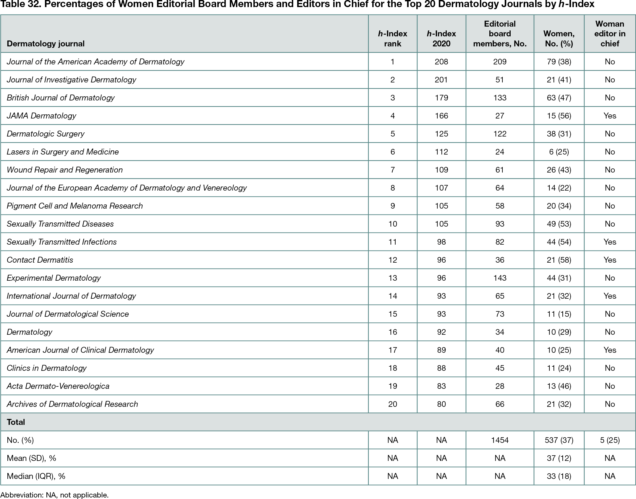 Women made up a mean (SD) of 37% (12%) and a median (IQR) of 33% (18%) of editorial boards across the top 20 dermatology journals (Table 32). The Journal of Dermatological Science (15%) and Journal of the European Academy of Dermatology and Venereology (22%) had the lowest proportion of women editors, while Contact Dermatitis (58%), Sexually Transmitted Infections (54%), and Sexually Transmitted Diseases (53%) had among the highest. The editorial board of JAMA Dermatology was observed to be 56% women after excluding International Advisory Committee members. Of the 20 journals, 5 journals (25%) had women editors in chief.