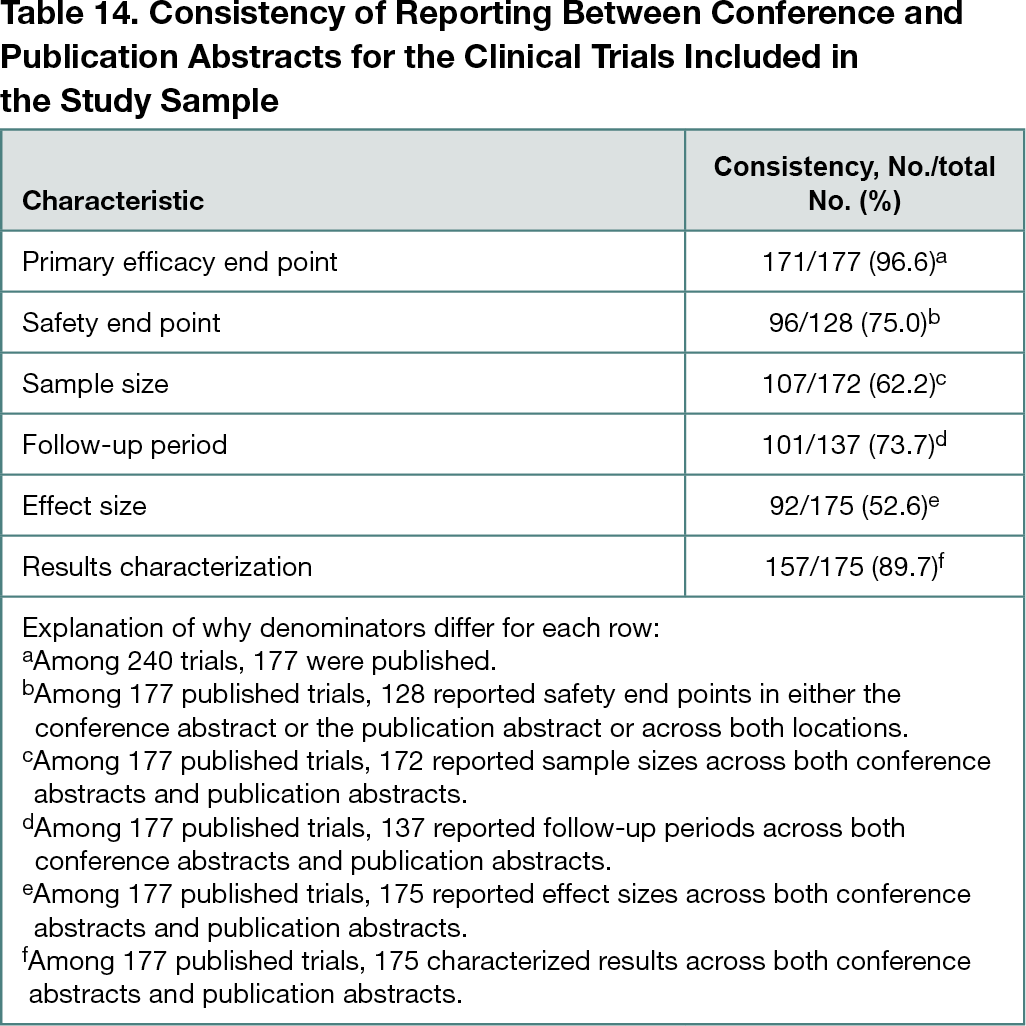 The sample comprised 240 trials presented at 12 conferences. Of these, 208 trials (86.7%) were registered, 95 (39.6%) reported summary results in a registry, and 177 (73.8%) were published; 82 trials (34.2%) were covered by the media, and 68 (28.3%) had press releases. Among the 177 published trials (Table 14 ), 171 (96.6%) reported consistent primary efficacy end points across abstracts, whereas 96 of 128 trials (75.0%) reported consistent safety outcomes. There were 107 of 172 trials (62.2%) with consistent sample sizes across abstracts, 101 of 137 trials (73.7%) that reported their follow-up periods consistently, 92 of 175 trials (52.6%) that described their effect sizes consistently, and 157 of 175 trials (89.7%) that characterized their results consistently. Among the trials that were published and had press releases, 32 of 32 (100%) characterized their results consistently across conference and publication abstracts and press releases. No trial characteristics were associated with reporting primary efficacy end points consistently.