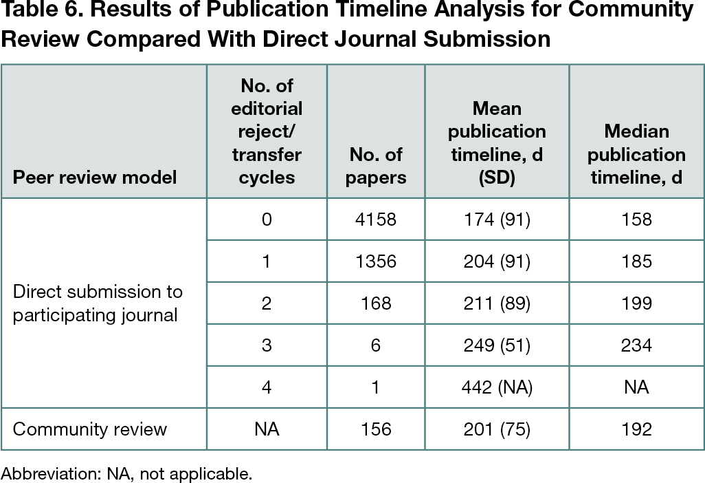 Of 1674 total Community Review submissions, 1237 (74%) were offered peer review at 1 or more participating journals. Of the 1237 offers, 579 were taken up by the authors (47% uptake of peer review offer; 35% of total submissions reviewed). Of 344 Community Review submissions with a final postreview outcome, 191 were accepted (56% postreview accept rate). In the same period, 13,615 of 41,638 unique manuscripts (33%) directly submitted to participating journals were sent for review, either at the original journal or following 1 or more cycles of editorial reject/transfer. Of 9966 direct submissions with a final postreview outcome, 5689 were accepted (57% postreview accept rate). The results of the publication timeline analysis are presented in Table 6. Author surveys indicated “consideration across a selection of high-quality journals” and “interest in concept” as the top reasons authors chose to submit to Community Review.