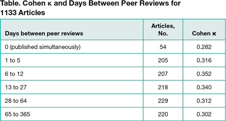 The analyzed dataset contained 1,133 articles and 2,266 reviewer reports, ie, the first 2 reviewer reports of each article. The median (interquartile range) time between the first 2 peer reviews was 18 (6-52) days. In aggregate, the breakdown of the peer review decision (“approved,” “approved with reservations,” or “not approved”) across the dataset was virtually identical between the 2 reviewers (724 [63.9%], 355 [31.3%], and 54 decisions [4.8%] vs 705 [62.2%], 372 [32.8%], and 56 [4.9%] decisions, respectively). However, comparing the recommendations made for each article individually, the Cohen κ was 0.330 (compared with 0.282 for the control group), indicating only a fair agreement between the reviewers. Moreover, the Cohen κ changed minimally with the length of time between the peer review publication dates (Table).