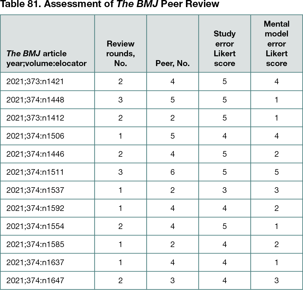 Forty-five peer reviewers produced 21 rounds of review for 12 articles (Table 81). The study error median score was 4.5, and the mental model error median score was 2 with the Mann-Whitney rejection of equal distributions at P < .05.