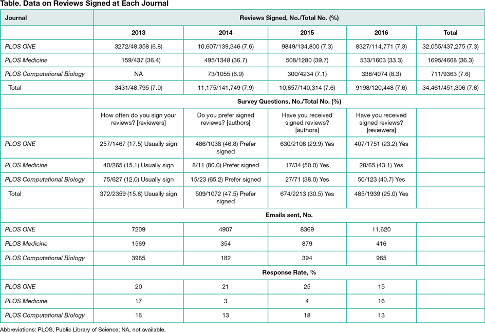 To investigate the rate at which Public Library of Science (PLOS) peer reviewers at 3 medical journals chose to sign or not sign their reviews, thus revealing or not revealing themselves to the authors of an article, and whether authors’ and reviewers’ stated values about signing reviews matched their behavior.